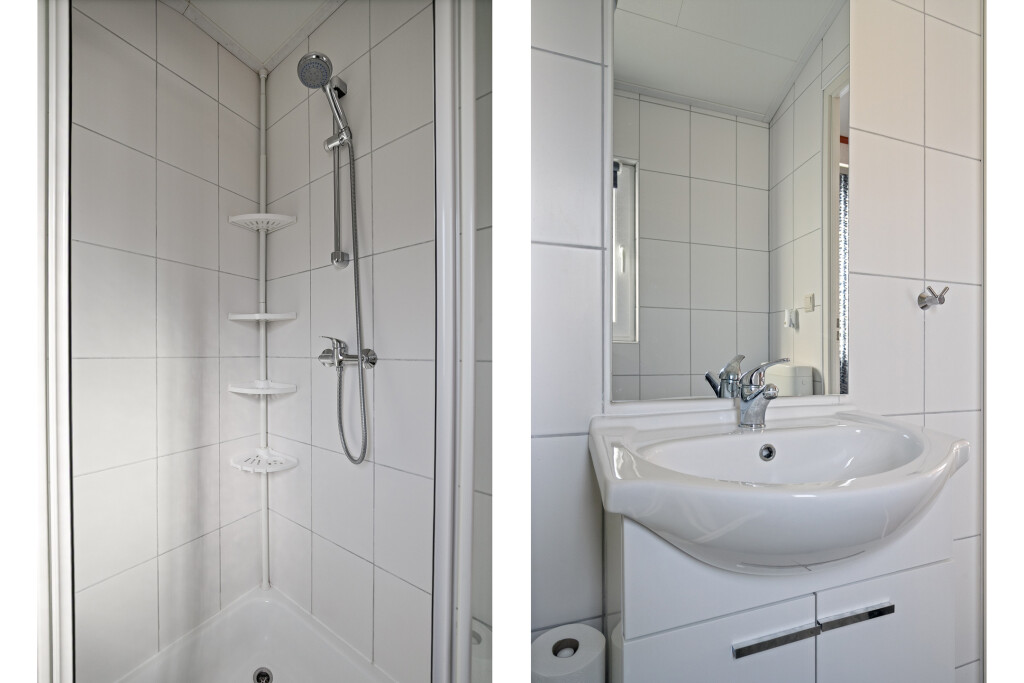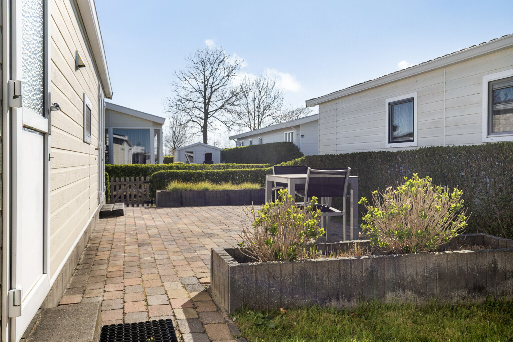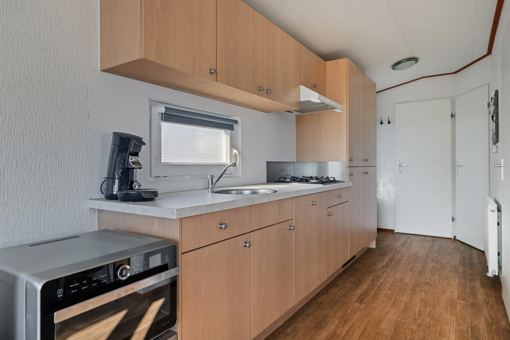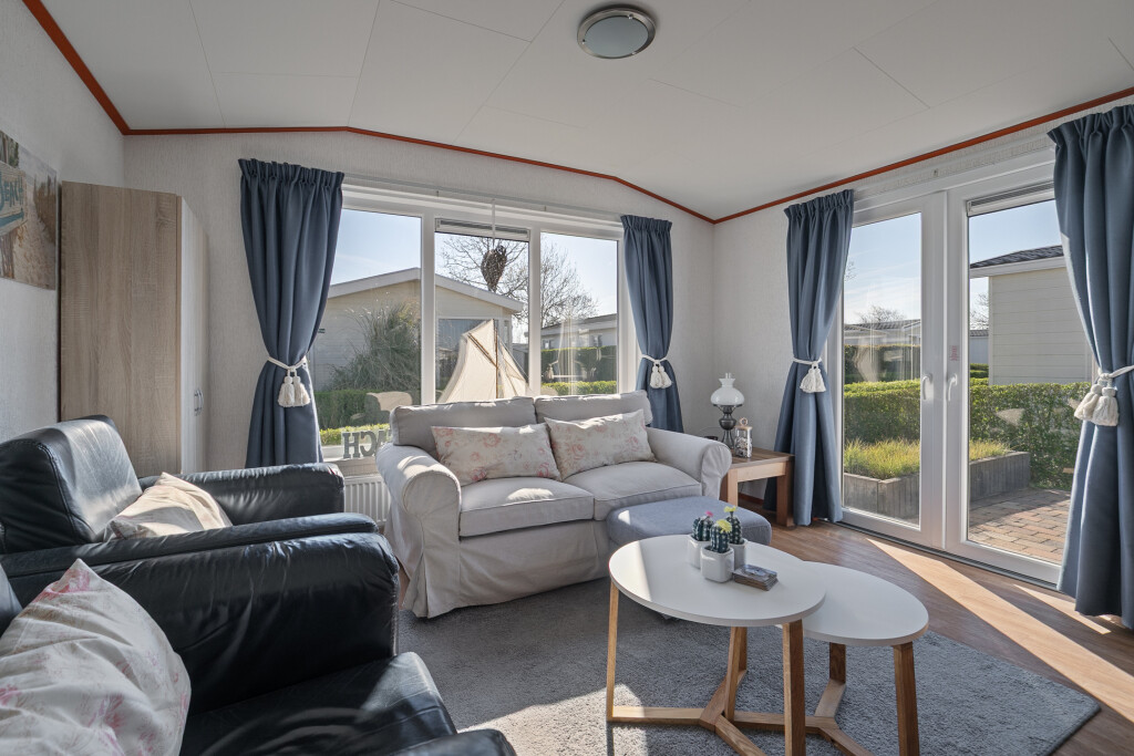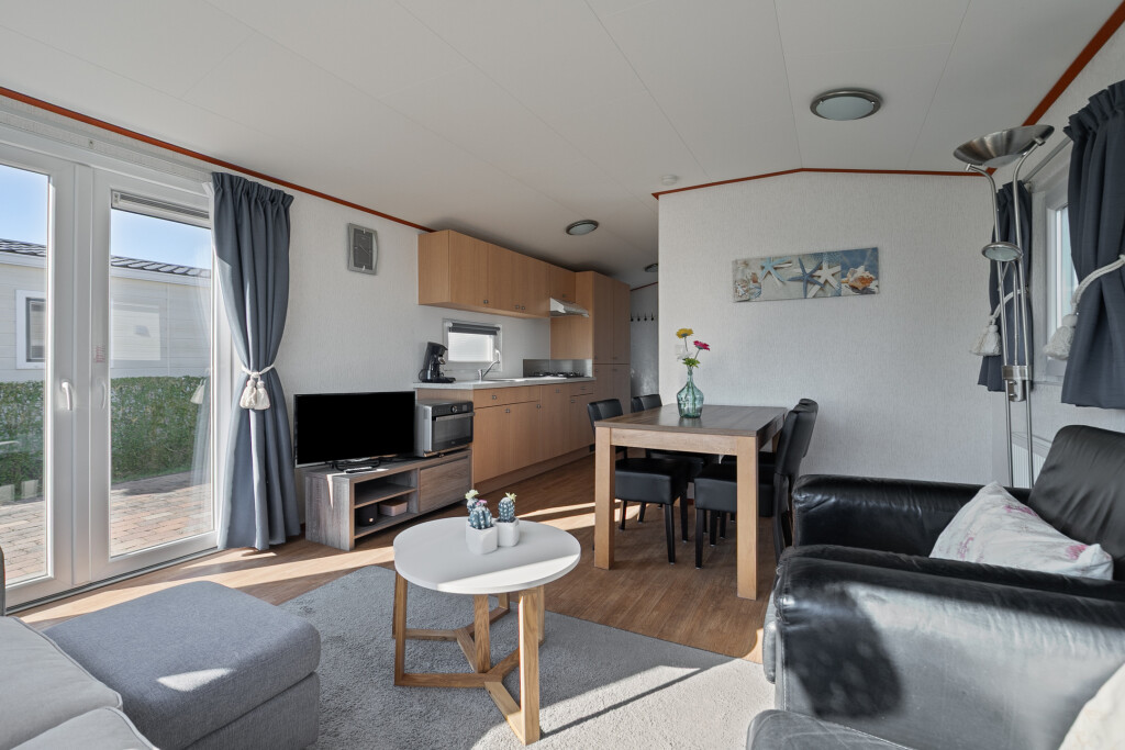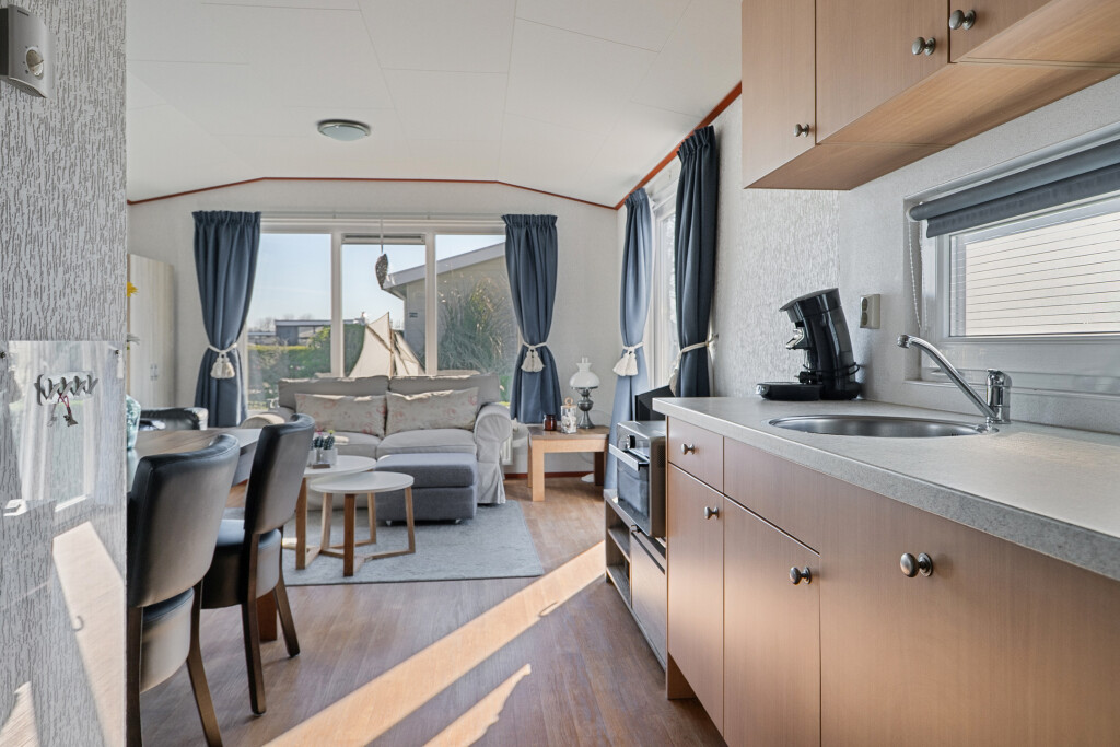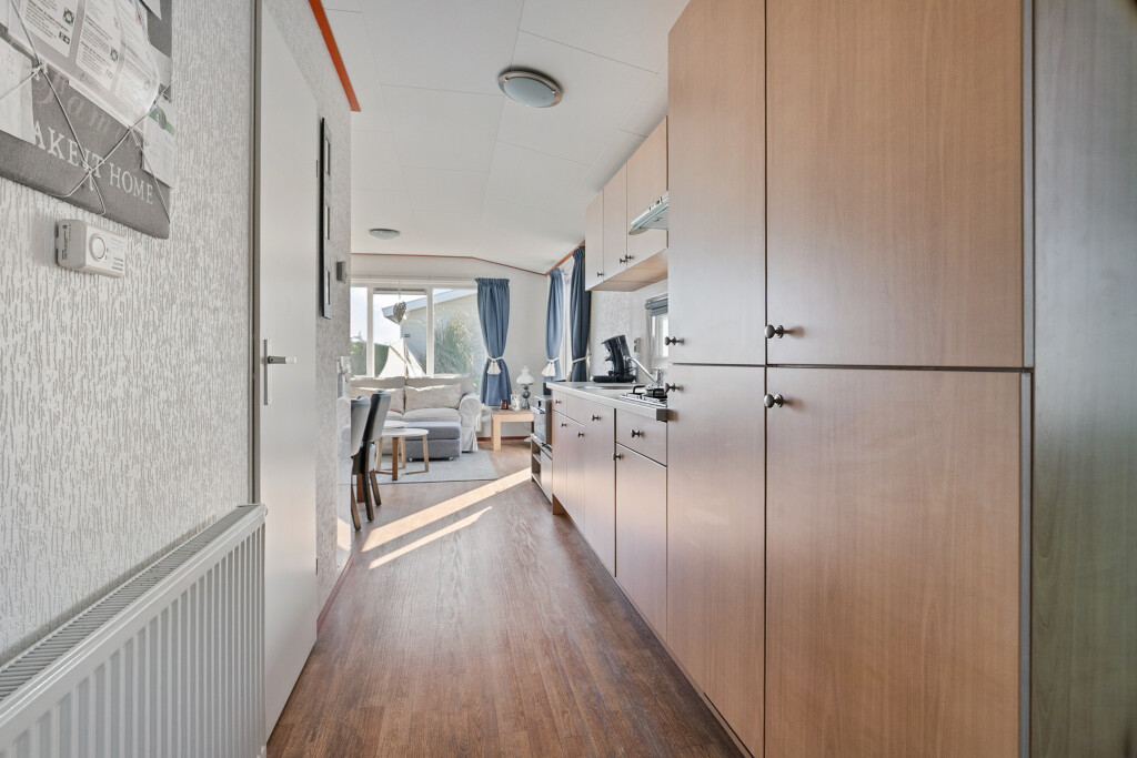 U betreedt het chalet via de hal, die toegang biedt tot alle vertrekken. De ruime woonkamer met openslaande tuindeuren en een open keuken compleet uitgerust met inbouwapparatuur, waaronder een 4-pits gaskookplaat, afzuigkap, koelkast met vriesvak en een vaatwasser (2023). Daarnaast beschikt het chalet over twee comfortabele slaapkamers en een nette badkamer met een douchecabine, wastafelmeubel en toilet.