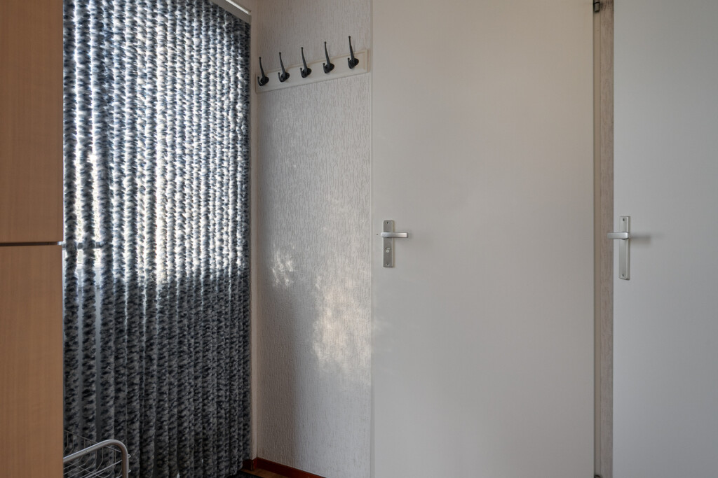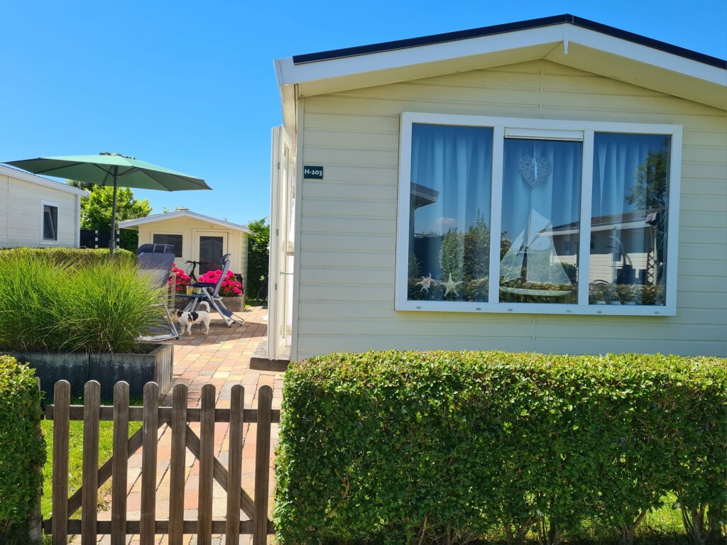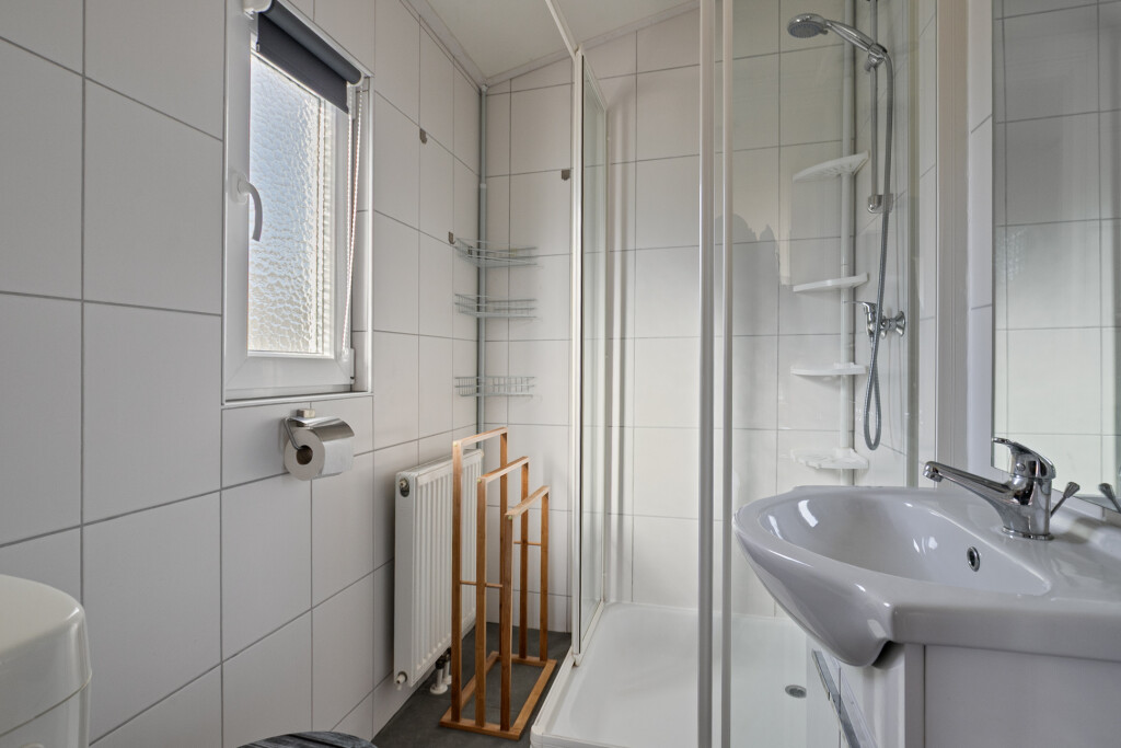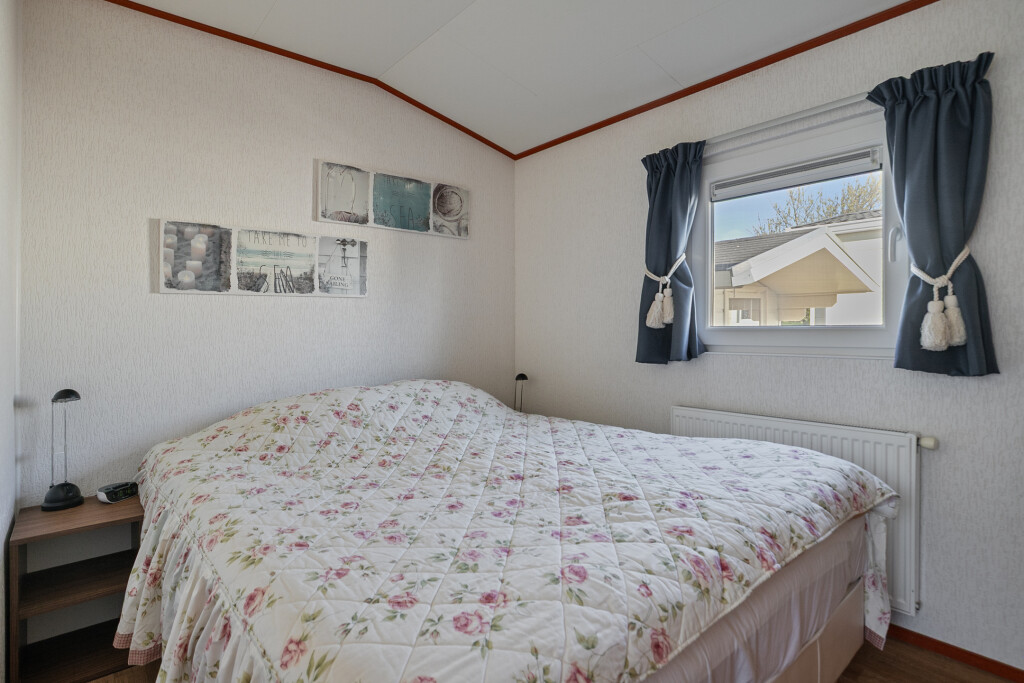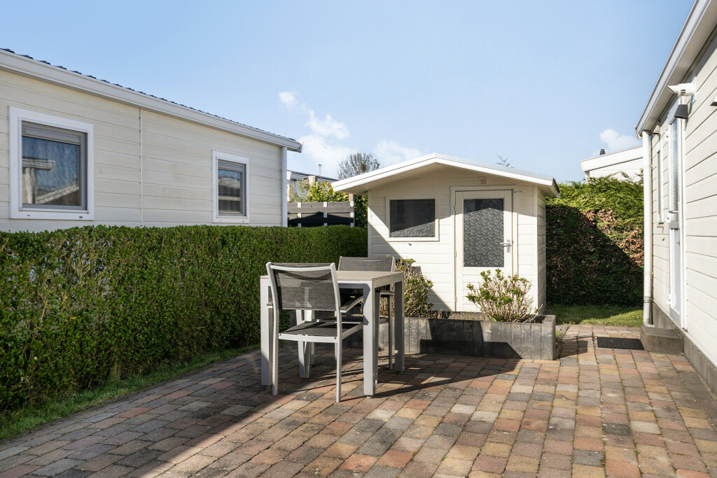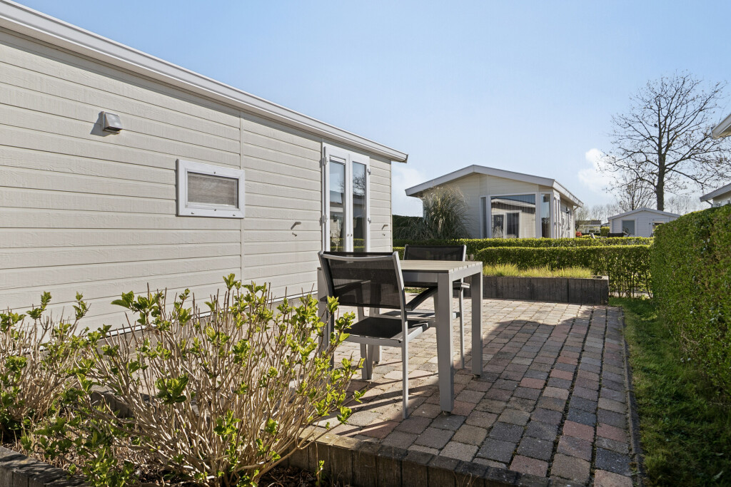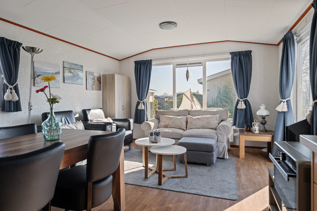 U betreedt het chalet via de hal, die toegang biedt tot alle vertrekken. De ruime woonkamer met openslaande tuindeuren en een open keuken compleet uitgerust met inbouwapparatuur, waaronder een 4-pits gaskookplaat, afzuigkap, koelkast met vriesvak en een vaatwasser (2023). Daarnaast beschikt het chalet over twee comfortabele slaapkamers en een nette badkamer met een douchecabine, wastafelmeubel en toilet.