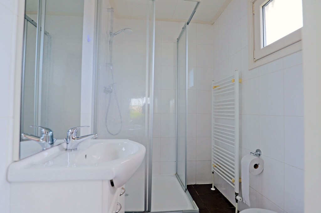 entree, woonkamer met tuindeuren naar het terras, open inbouwkeuken met gaskookplaat, afzuigkap combi-magnetron, koelkast en vaatwasser, 2 slaapkamers waarvan 1 met een ruime schuifkast, badkamer met toilet, douche en wastafelmeubel.