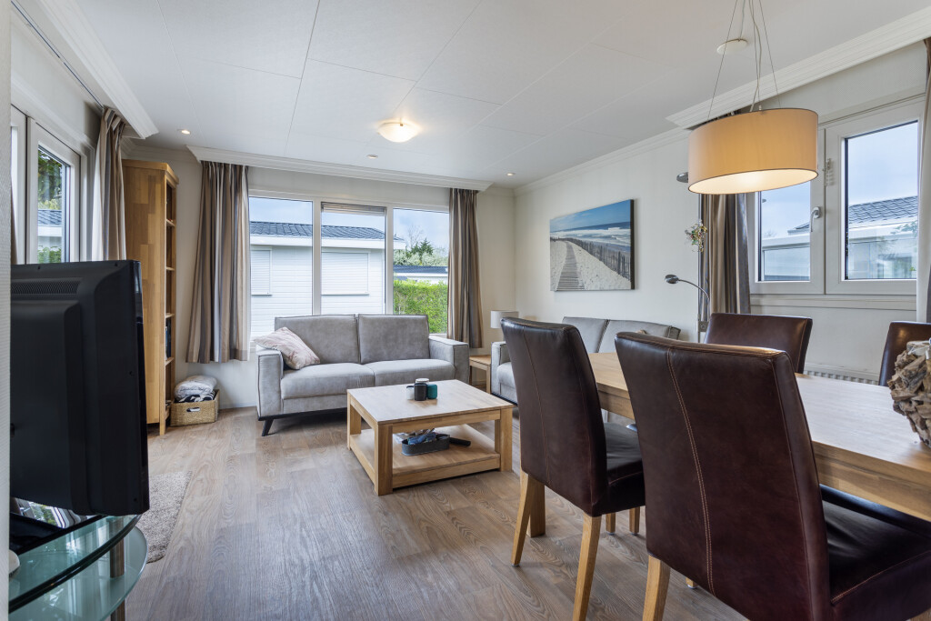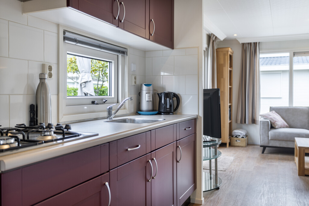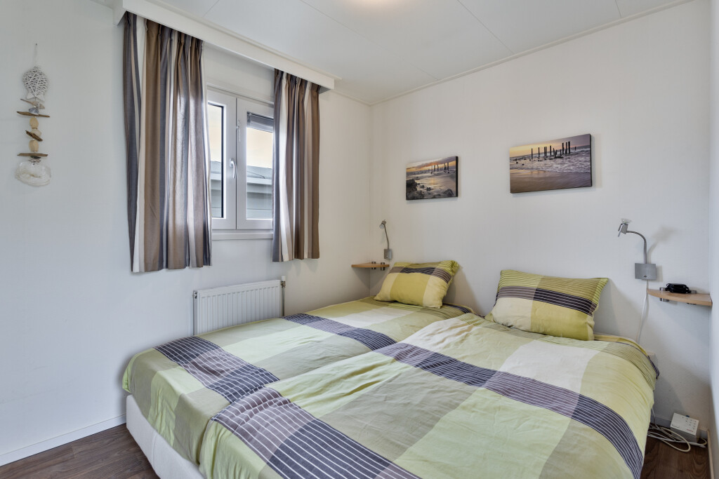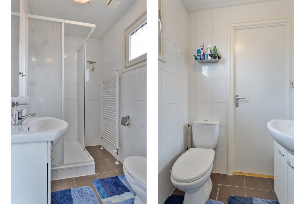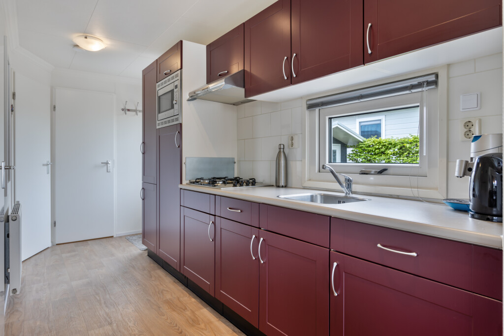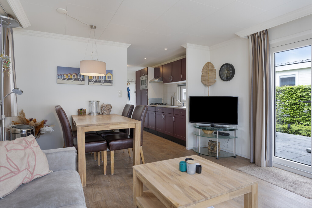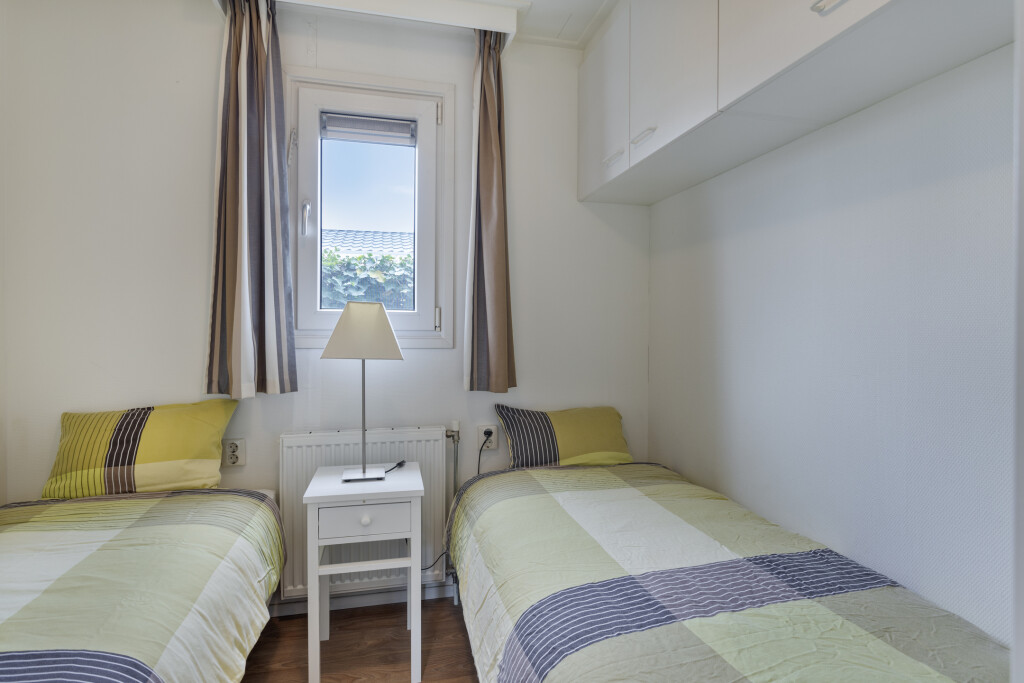 Bij binnenkomst komt u in de hal, die toegang biedt tot de badkamer. De badkamer is uitgerust met een douchecabine, wastafelmeubel en een toilet. Vanuit de hal betreedt u de lichte woonkamer met grote raampartijen en openslaande deuren naar de tuin met terras. De open inbouwkeuken is voorzien van een 4-pits gaskookplaat, afzuigkap, combi-oven en een koelkast. Het chalet beschikt daarnaast ook over twee slaapkamers, waarvan één met een vaste kast. Het gehele chalet is voorzien van een nette vinyl vloer.