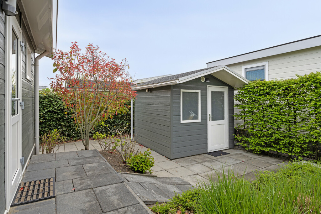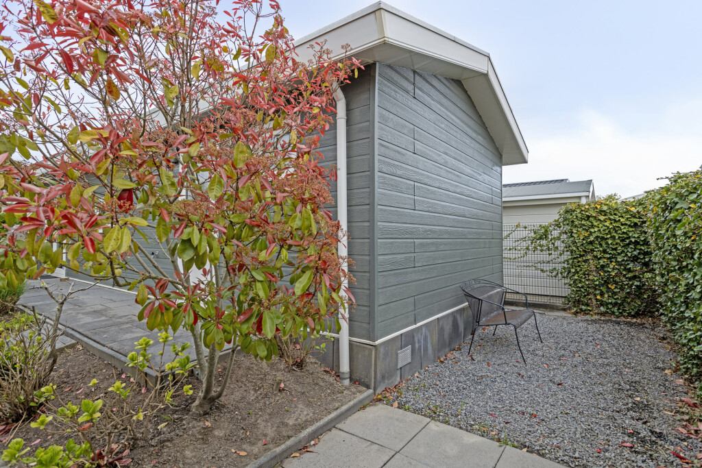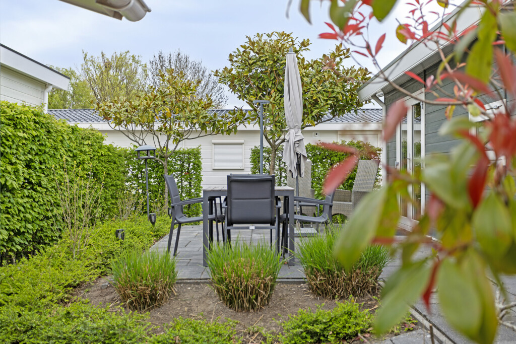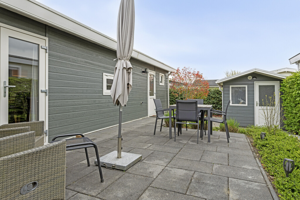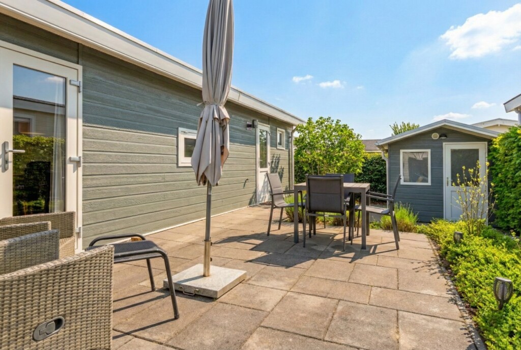 De zonnige en ruime tuin biedt op het terras voldoende ruimte voor een gezellige zit- en/of eethoek. Daarnaast beschikt het chalet over een tuinhuis, ideaal voor extra opslagruimte. Extra pluspunt: het chalet beschikt over een eigen parkeervoorziening.