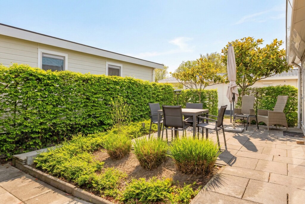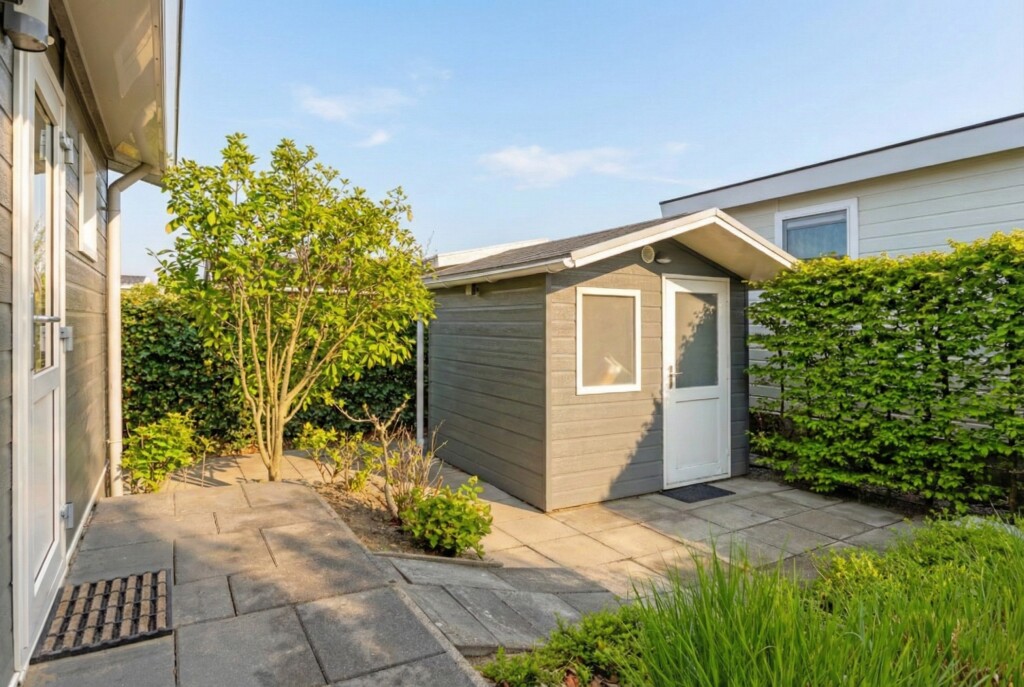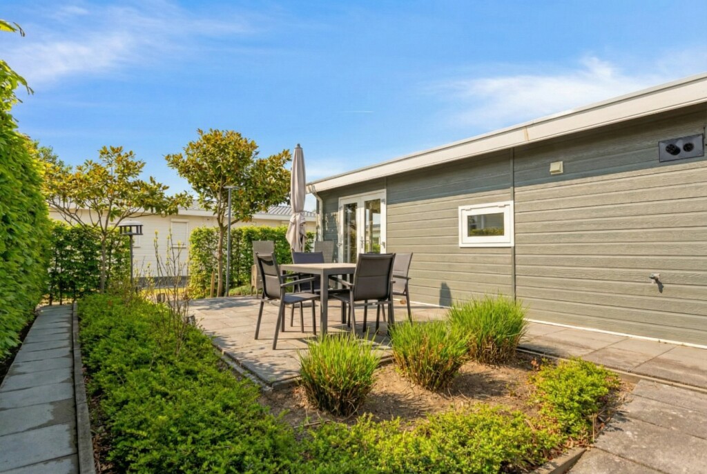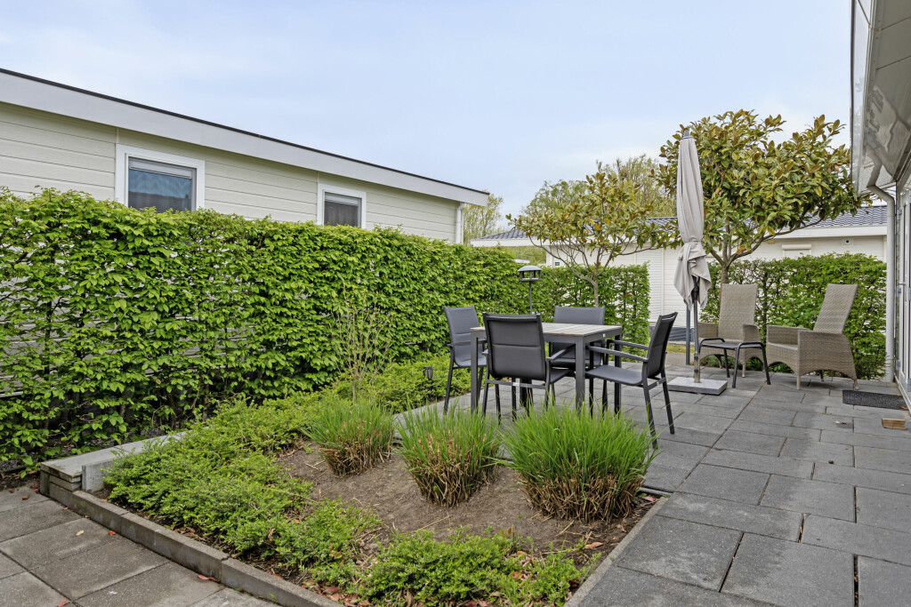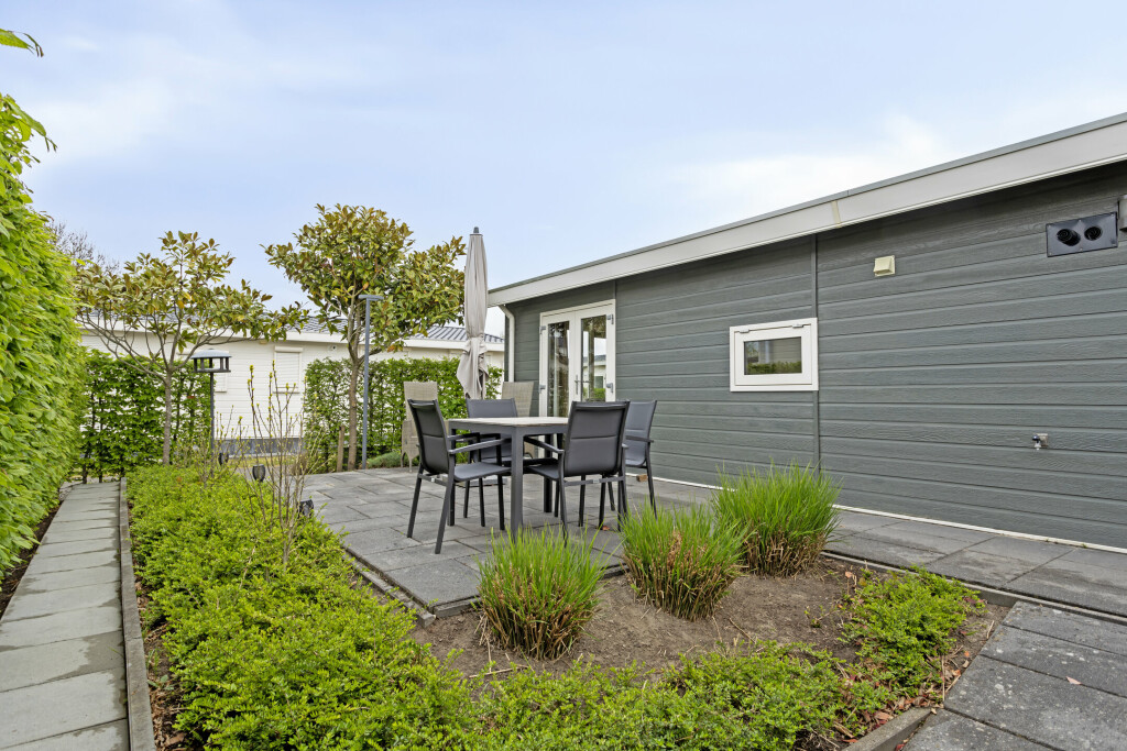 De zonnige en ruime tuin biedt op het terras voldoende ruimte voor een gezellige zit- en/of eethoek. Daarnaast beschikt het chalet over een tuinhuis, ideaal voor extra opslagruimte. Extra pluspunt: het chalet beschikt over een eigen parkeervoorziening.
