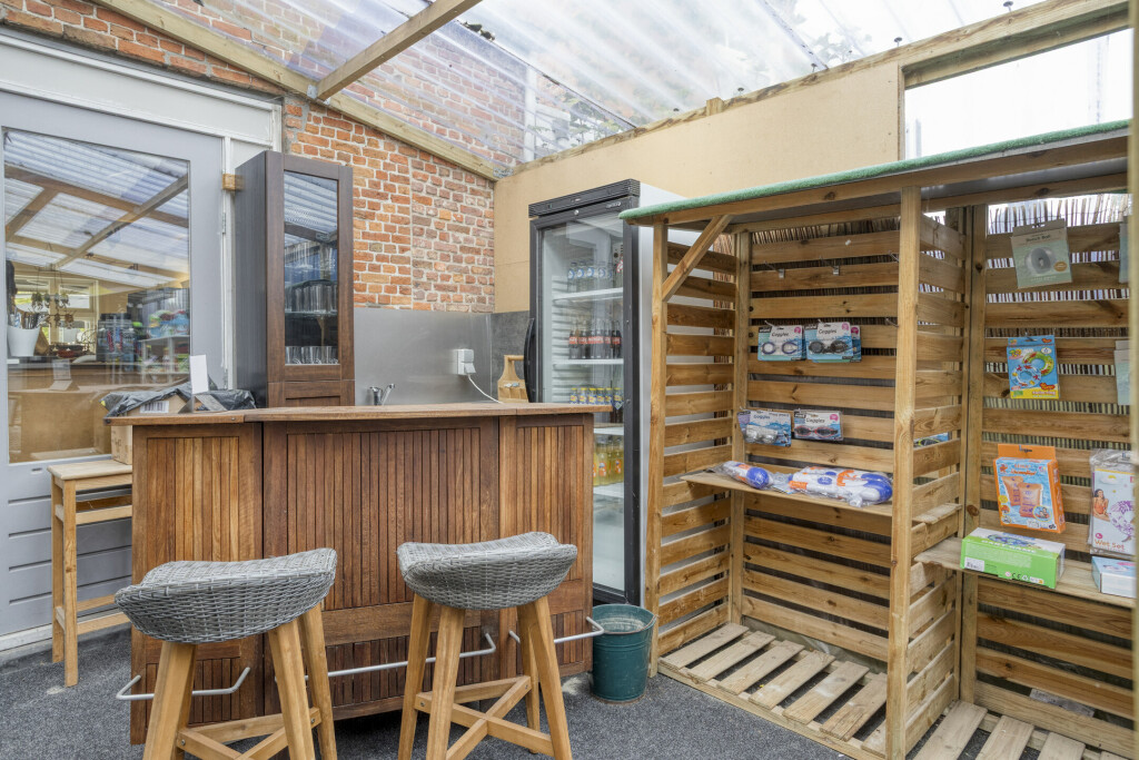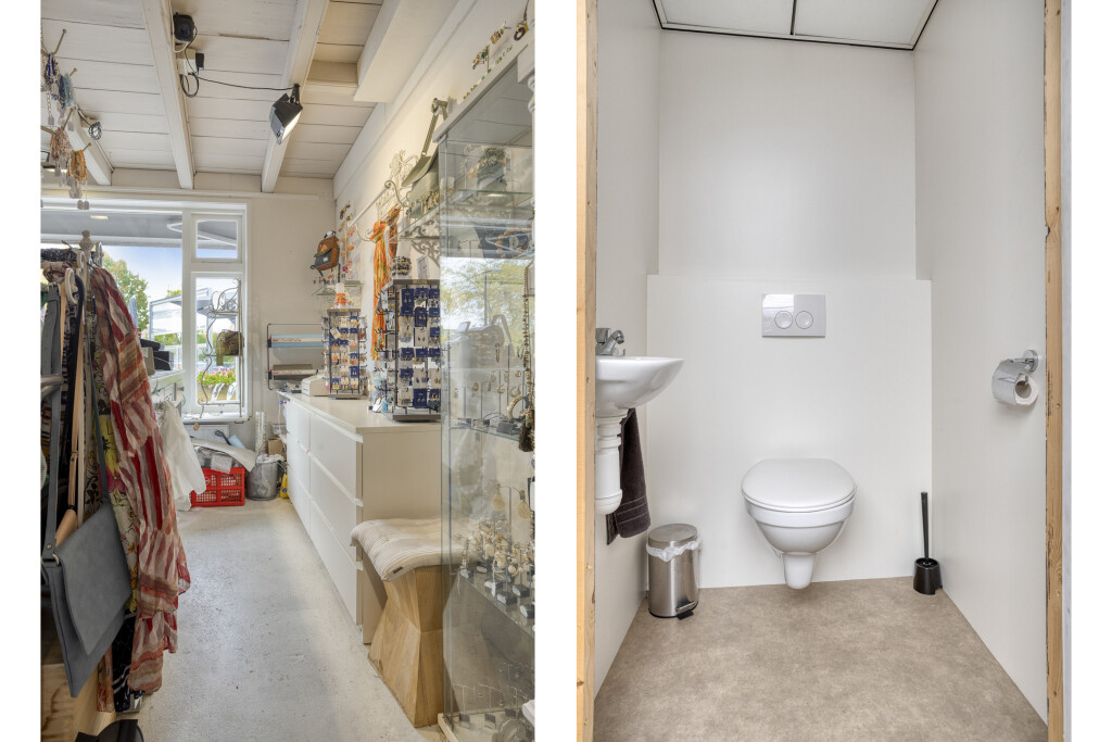 Achter de winkelruimte bevindt zich een patio met als verrassend pluspunt dat tevens gebruikt kan worden voor uitbreiding van het commerciële oppervlak of als sfeervolle buitenruimte voor horecadoeleinden. Vanuit hier zijn er doorgangen naar twee praktische bergruimtes, een kantoor en twee toiletten, waardoor de bedrijfsvoering efficiënt en professioneel ingericht kan worden.
