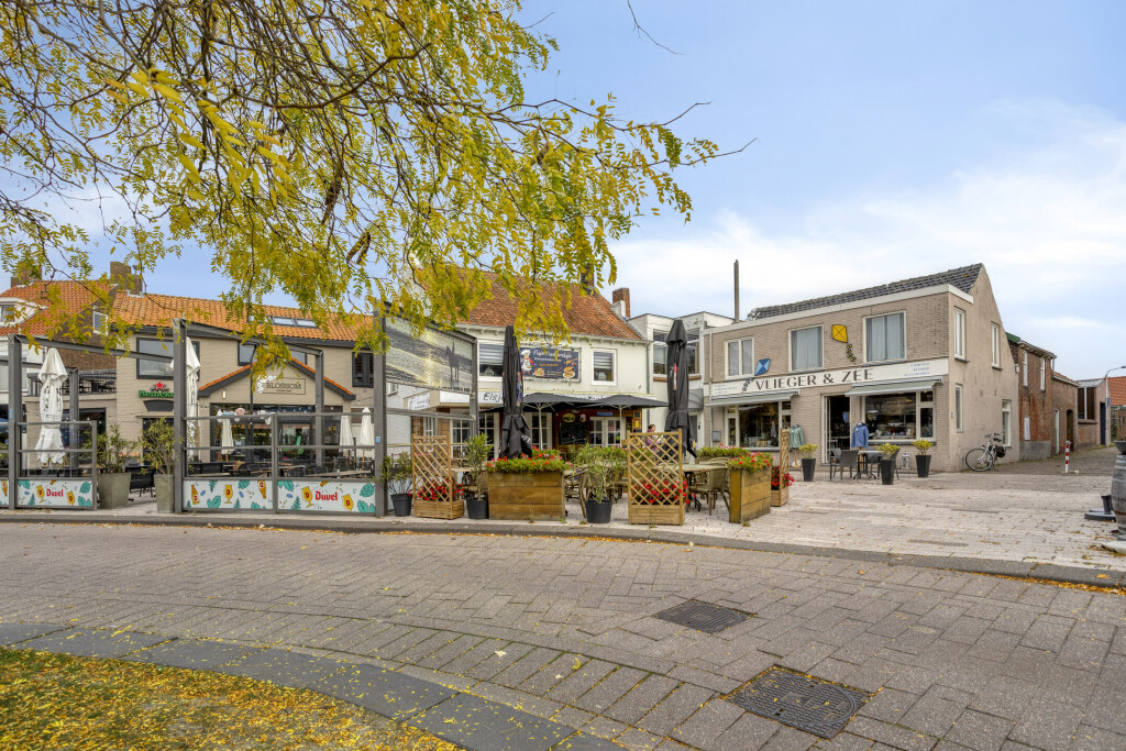 Uniek object met winkel-/horecabestemming, woonruimte, garage én loods – Midden op het Spuiplein in Breskens!