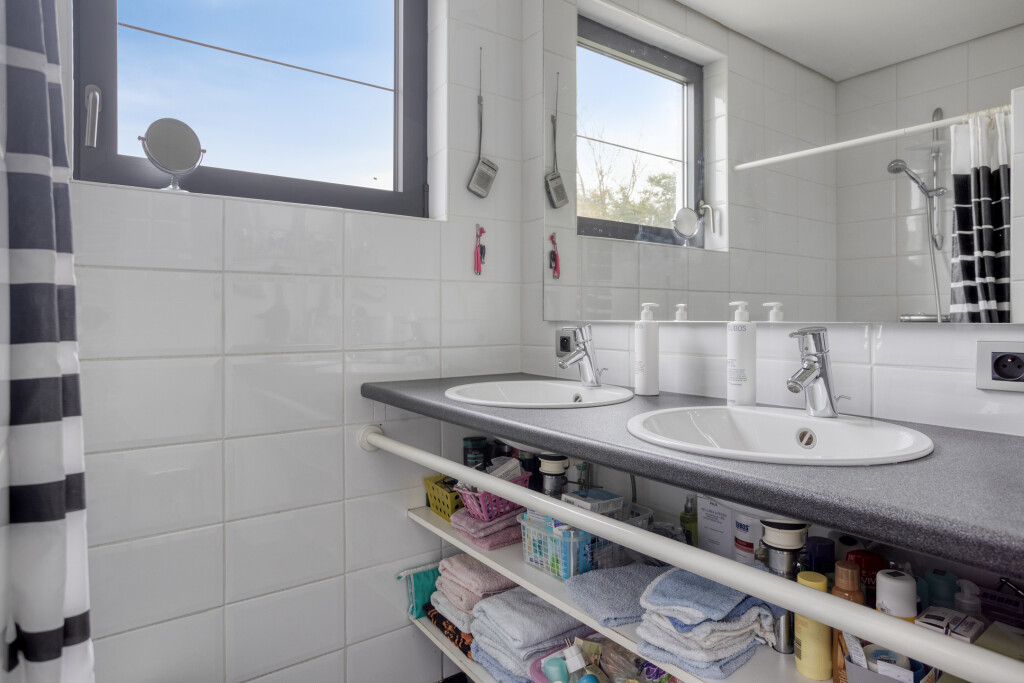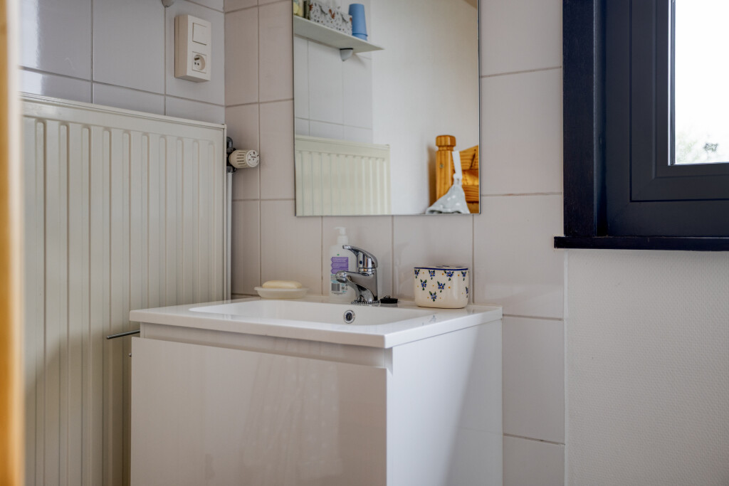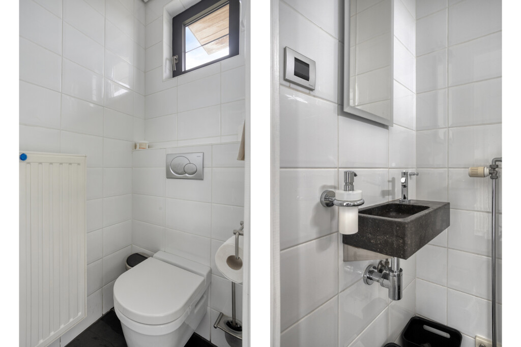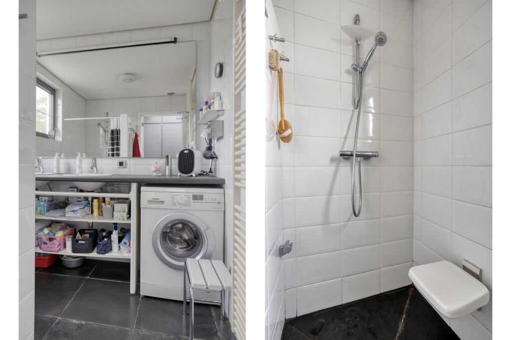Op de begane grond bevindt zich tevens de badkamer, voorzien van een ruime inloopdouche, dubbel wastafelmeubel met grote spiegel en een handdoek radiator.
