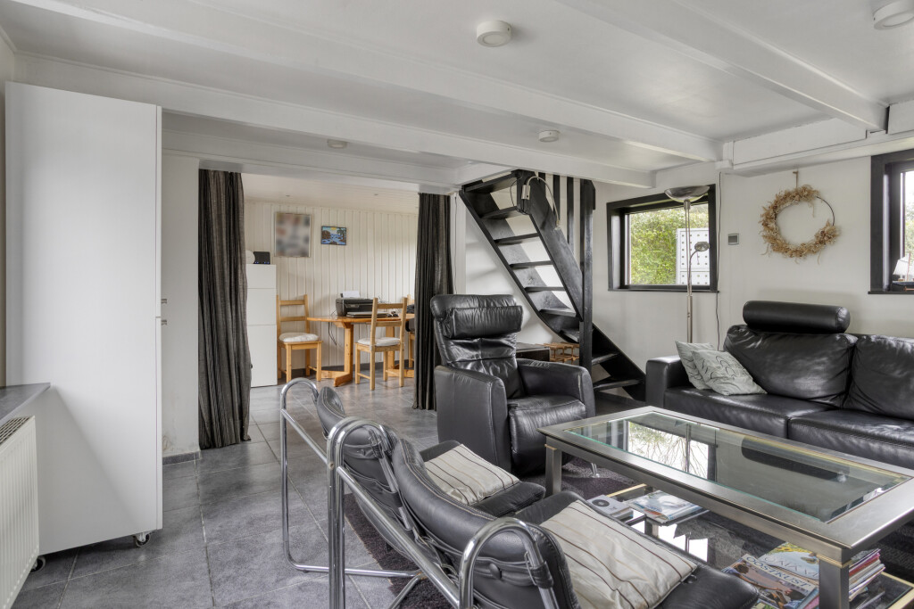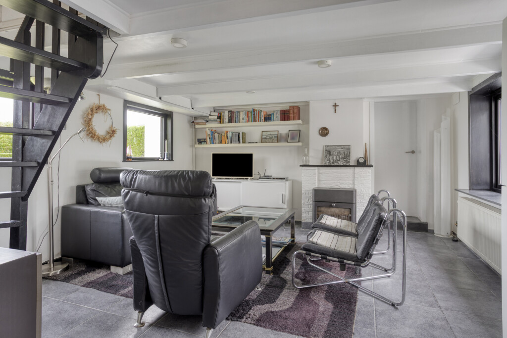 De woonkamer is sfeervol afgewerkt met een tegelvloer, balkenplafond en een houtkachel, wat zorgt voor een warme en huiselijke sfeer. Via de tuindeuren heeft u direct toegang tot de tuin.