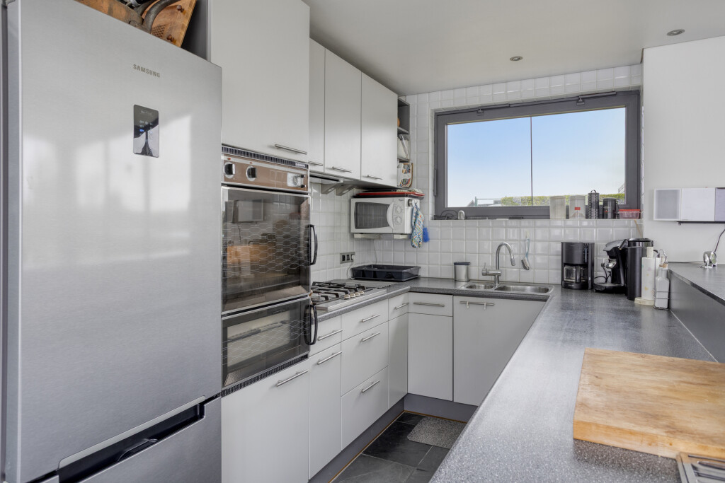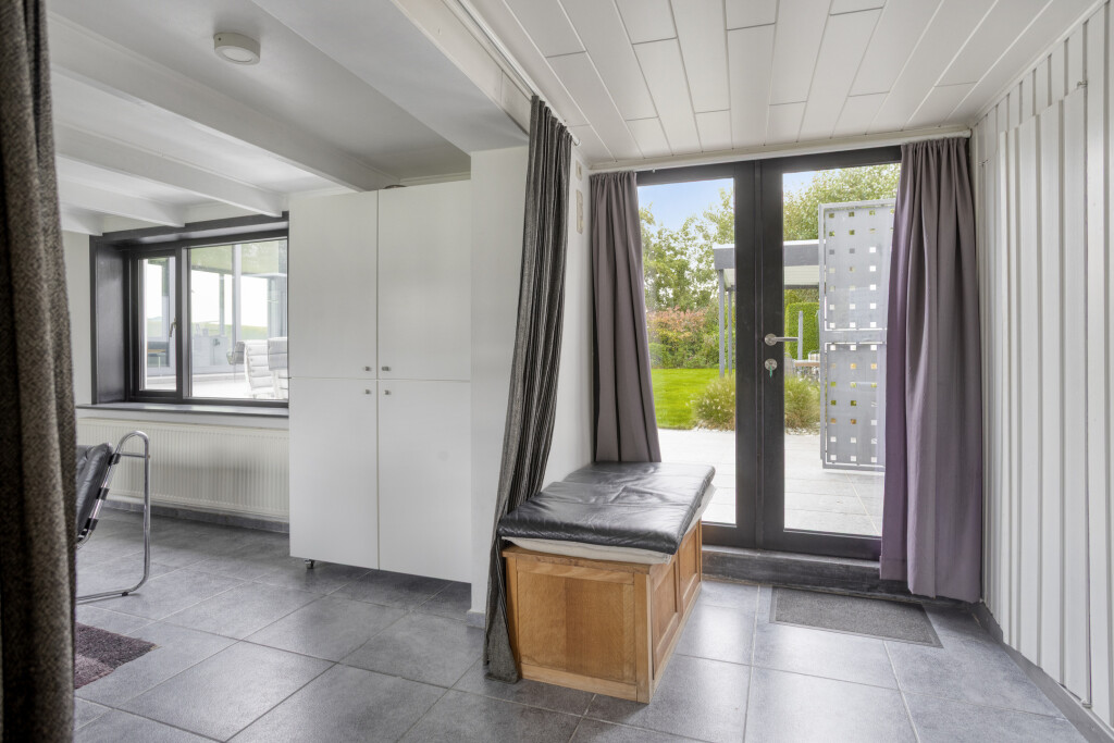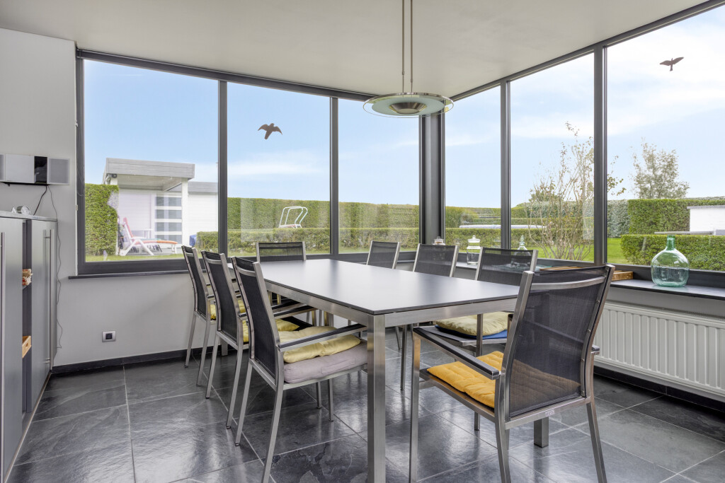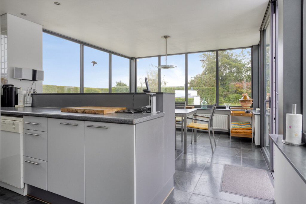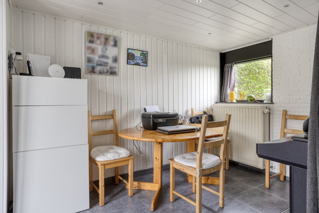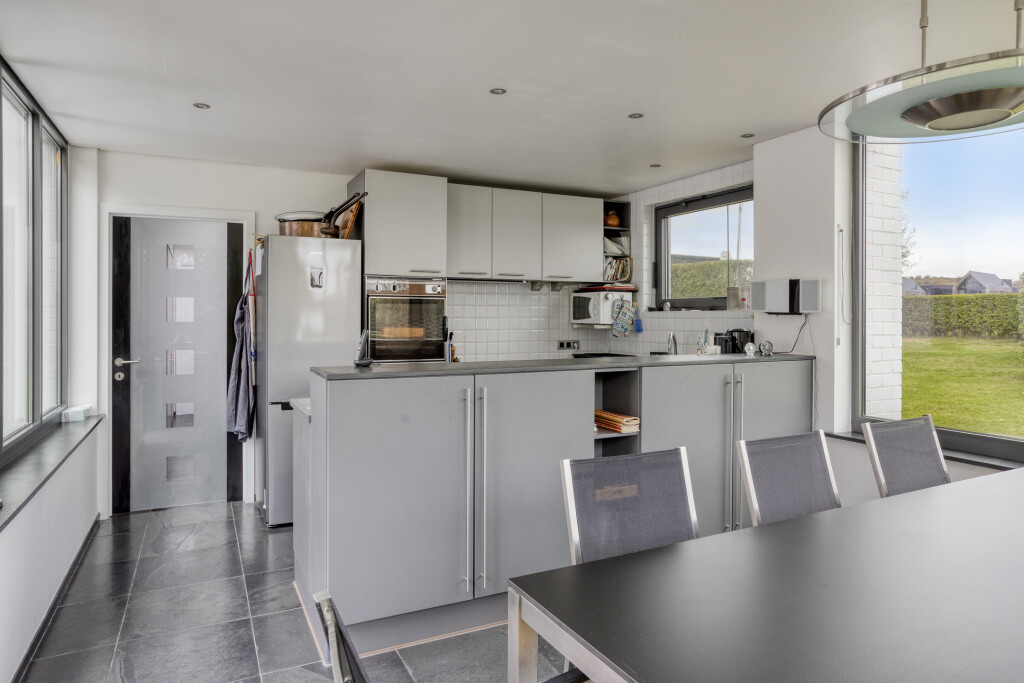 De woonkeuken is een aangename, lichte ruimte met ramen rondom en uitzicht over de royale tuin. De keuken is uitgerust met een 4-pits gasstel, vaatwasser, koel-vriescombinatie, oven en warmhoud lade. Een schuifpui biedt toegang tot het terras en de tuin, waardoor binnen en buiten naadloos in elkaar overgaan.