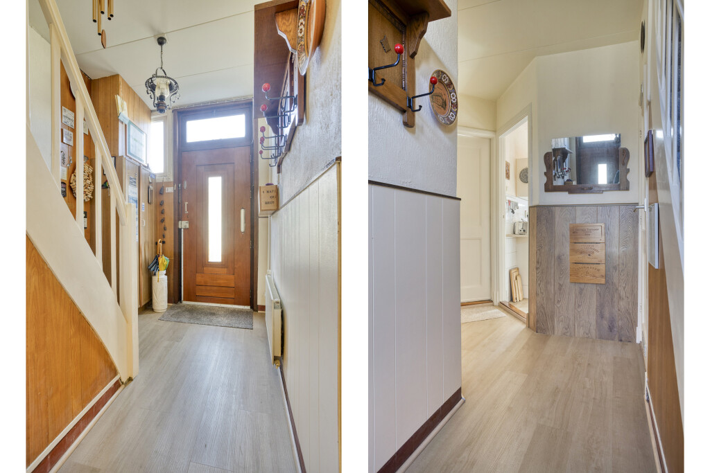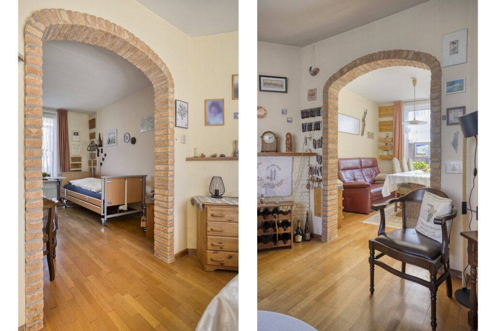 U komt binnen in de hal met toegang tot de eetkamer en de gesloten keuken. De eetkamer biedt doorgang naar de woonkamer. Woon- en eetkamer staan met elkaar in open verbinding, maar worden op sfeervolle wijze van elkaar gescheiden door een fraaie stenen boog.