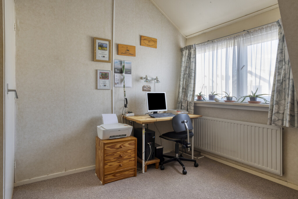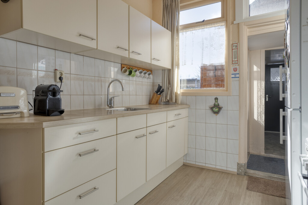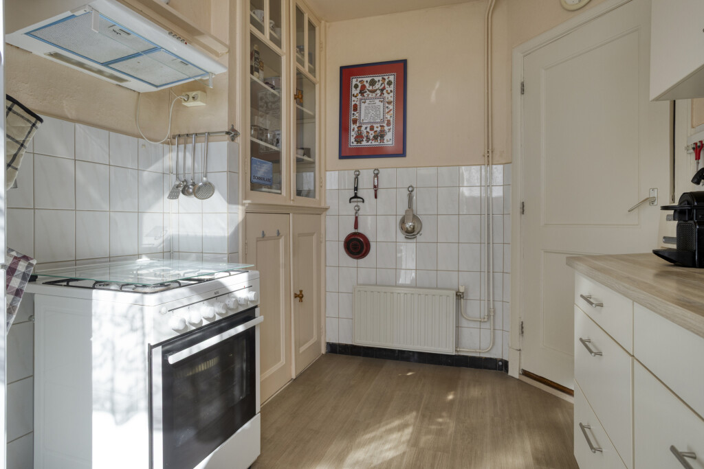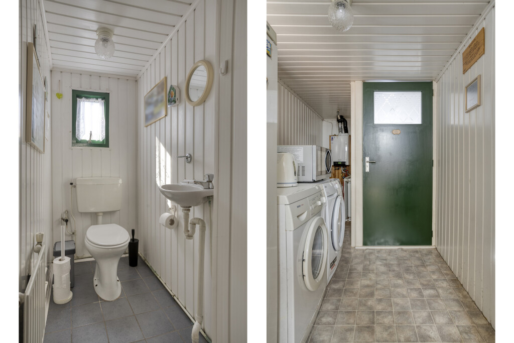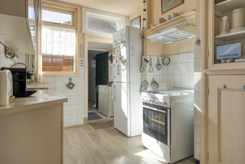 De keuken is voorzien van een keukenblok met losstaande apparatuur, waaronder een gasfornuis met oven en afzuigkap en een koelkast met vriesvak. Daarnaast beschikt de keuken over een praktische vaste kast voor extra bergruimte. Vanuit de keuken bereikt u de bijkeuken en de separate toiletruimte. De bijkeuken biedt toegang tot de achtertuin.