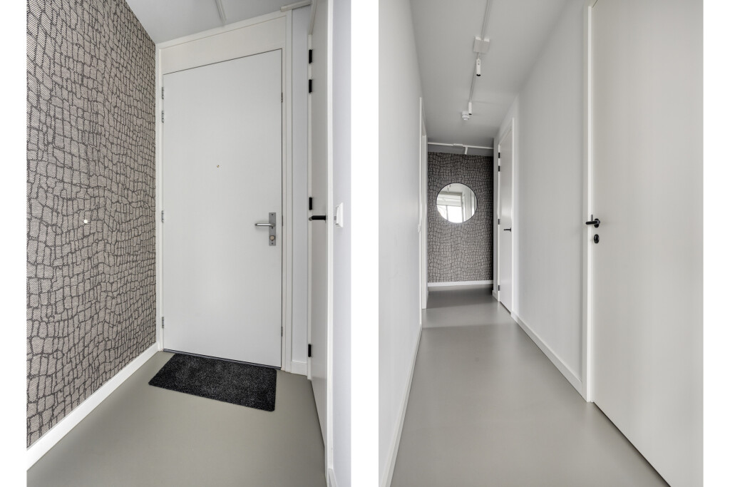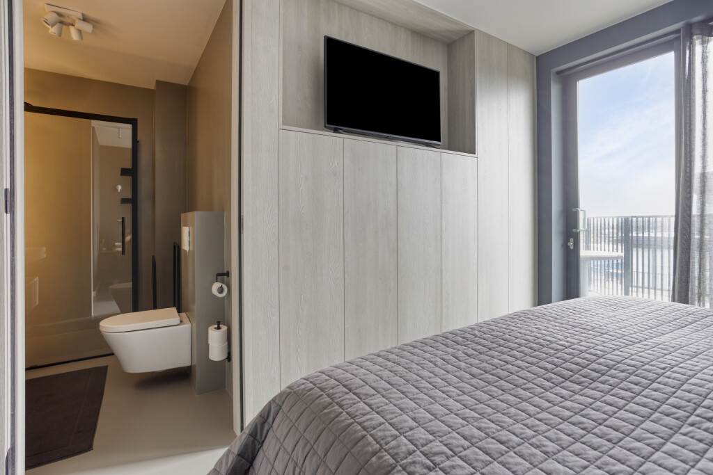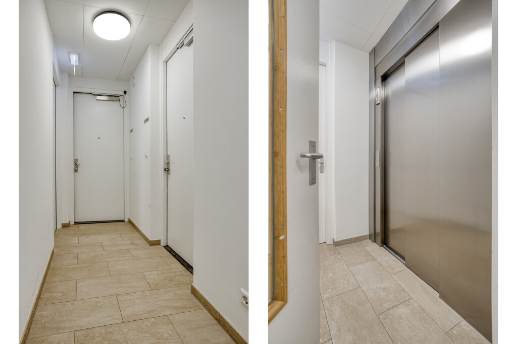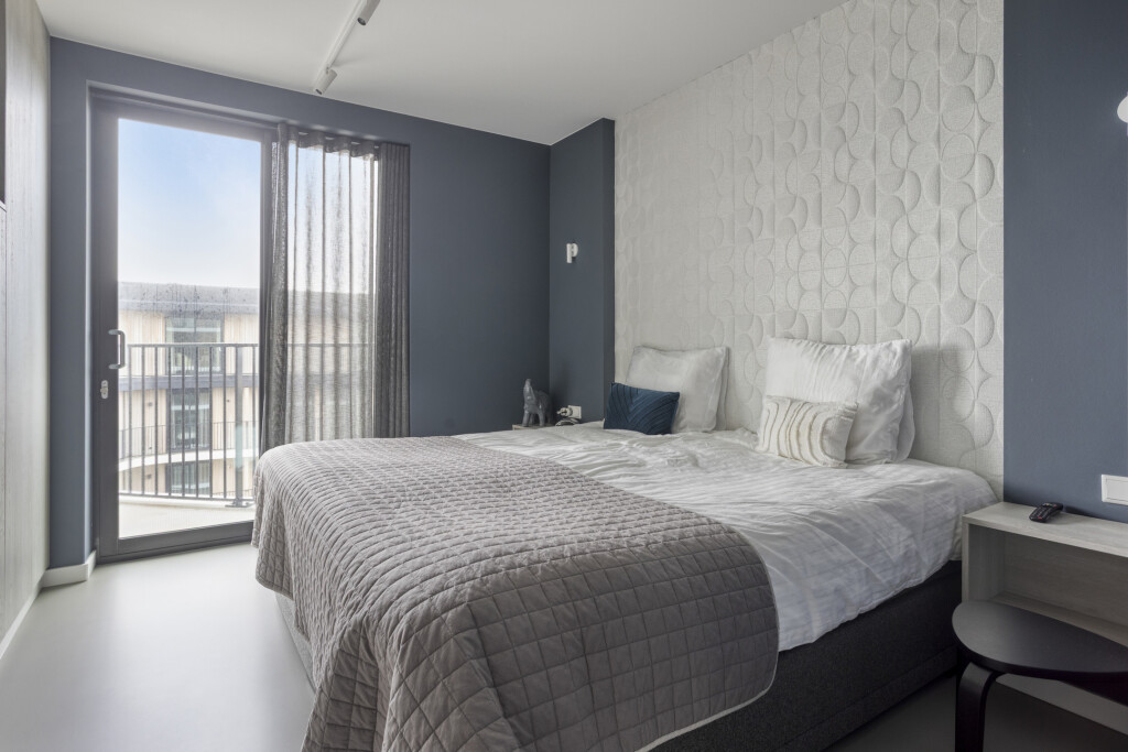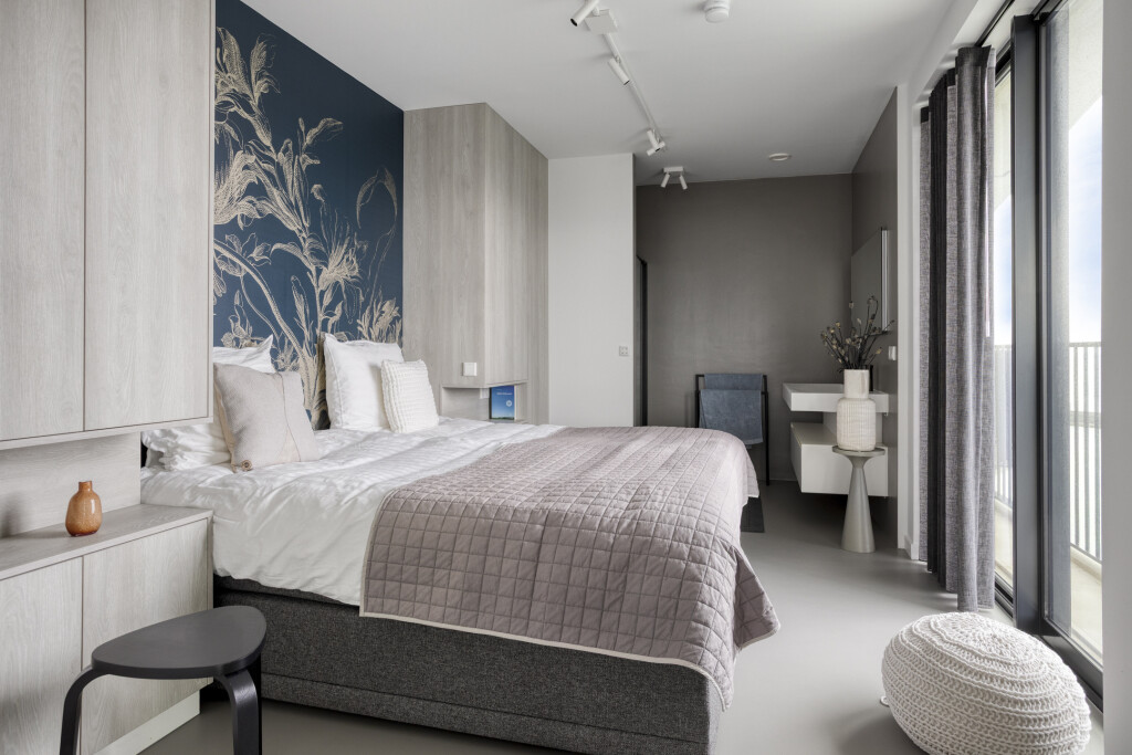 Het appartement is gelegen op de zevende verdieping en is zowel per trap als lift bereikbaar. U betreedt het appartement via een ruime hal met garderobe, die toegang biedt tot de verschillende vertrekken. Aan het begin van het appartement bevindt zich een slaapkamer met een tweepersoonsbed en een badkamer en suite, uitgerust met een douche, een dubbel wastafelmeubel en een toilet. Daarnaast beschikt de slaapkamer over vaste kastruimte en biedt deze toegang tot het balkon.