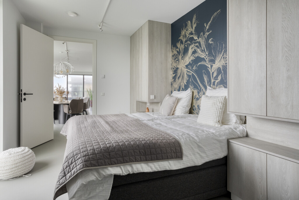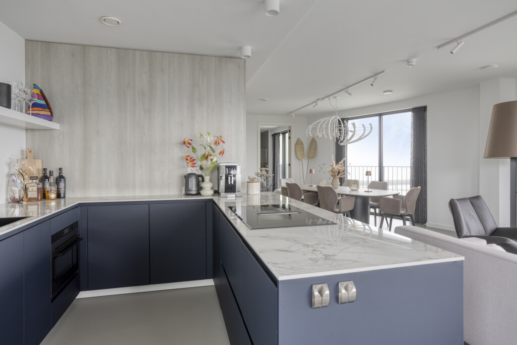 De royale woonkamer beschikt over een comfortabele zithoek met televisie en een eethoek. De luxe open keuken is van alle gemakken voorzien, waaronder een inductiekookplaat met geïntegreerde afzuiging, combi-oven, een vaatwasser, koelkast en voldoende kastruimte. Vanuit de woonkamer bereikt u de tweede slaapkamer, eveneens voorzien van een tweepersoonsbed en een en-suite badkamer met een dubbele wastafel en inloopdouche. Beide slaapkamers zijn stijlvol afgewerkt met vaste kasten en luxe wandafwerking.