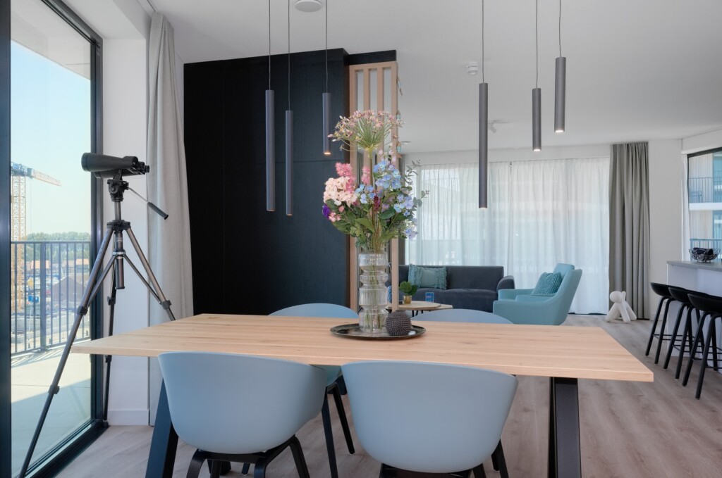Via de schuifdeuren in de woonkamer en slaapkamers stapt u op het ruime terras dat rondom het appartement loopt. Hierdoor kunt u altijd een zonnig of beschut plekje vinden om te genieten van het weidse uitzicht over het strand van Breskens en de Westerschelde. Daarnaast heeft u in de avond prachtig uitzicht op de zonsondergang.