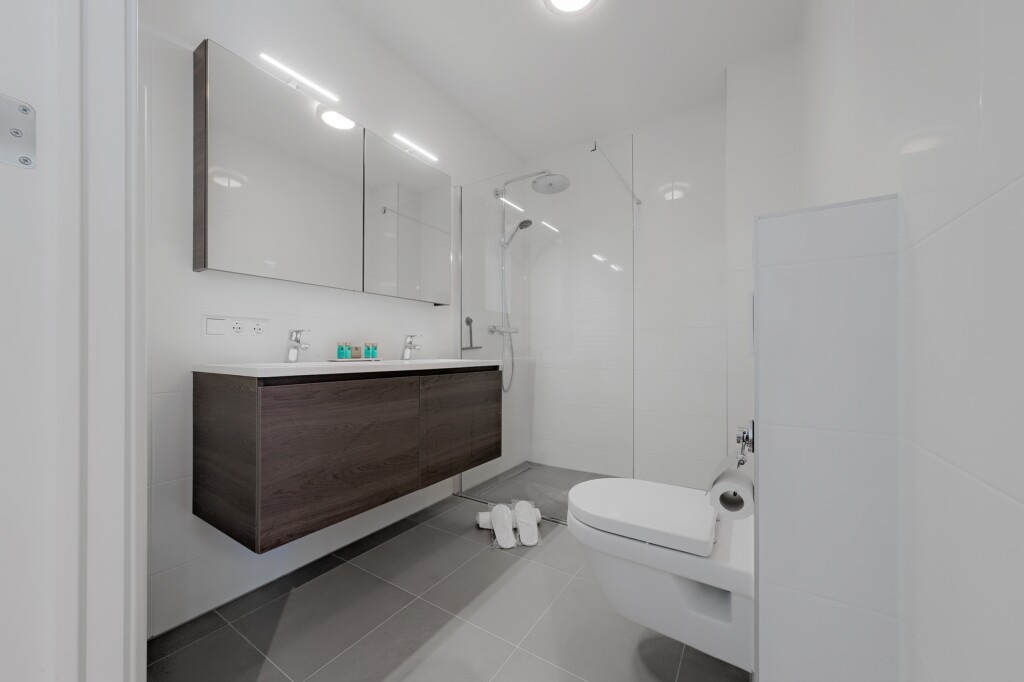 De royale woonkamer beschikt over een comfortabele zithoek met televisie en een eethoek. De luxe open keuken is van alle gemakken voorzien, waaronder een inductiekookplaat met afzuiging, een combi-oven, koel-vriescombinatie, vaatwasser en voldoende kastruimte. Vanuit de woonkamer bereikt u de tweede slaapkamer, eveneens voorzien van een tweepersoonsbed en een en suite badkamer met wastafel en inloopdouche. Beide badkamers zijn stijlvol afgewerkt met grootformaat wand- en vloertegels.