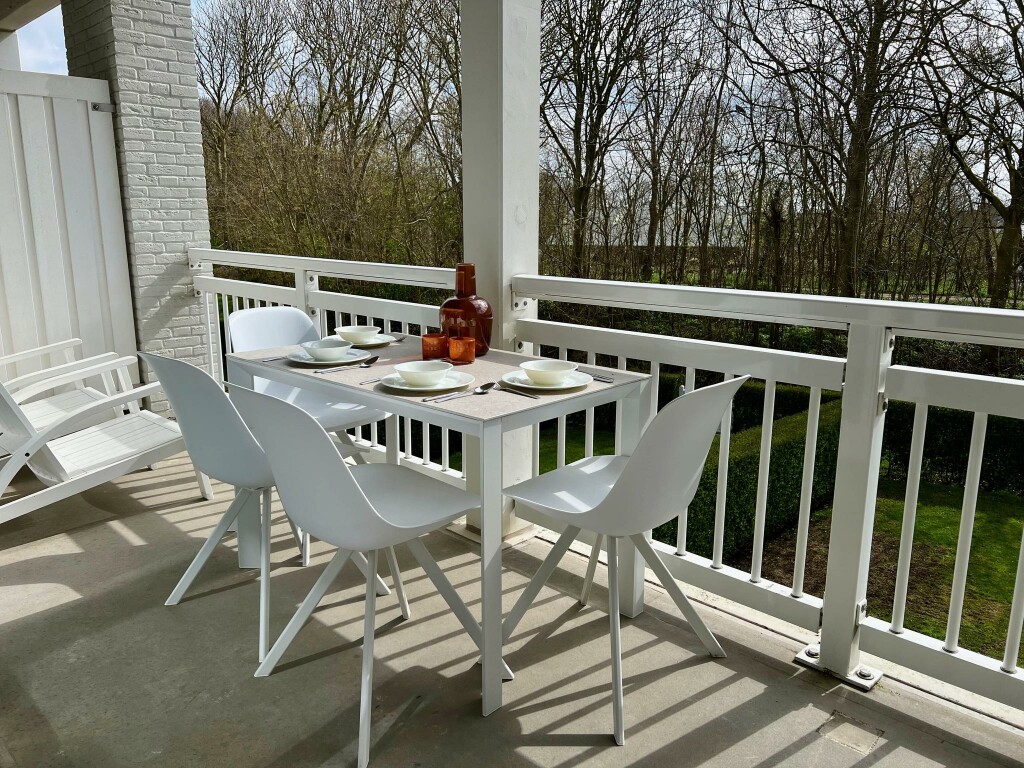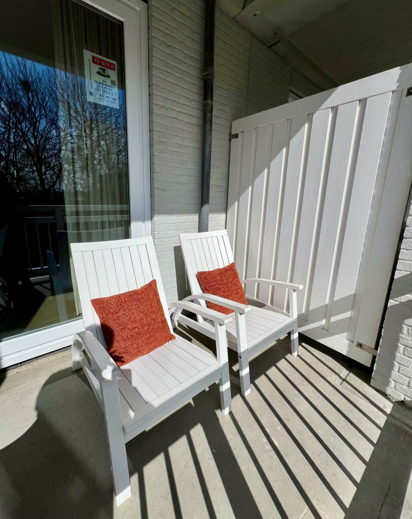 Het zonnige balkon op het zuiden nodig uit tot ontspanning en biedt een prachtig uitzicht op de omgeving, perfect voor rustige momenten en gezellig samenzijn.