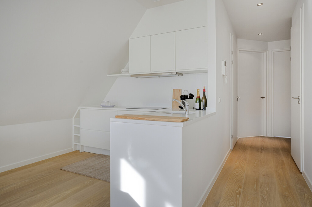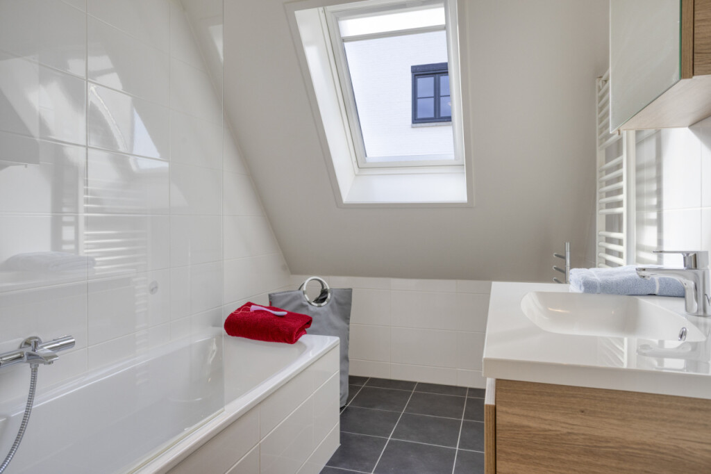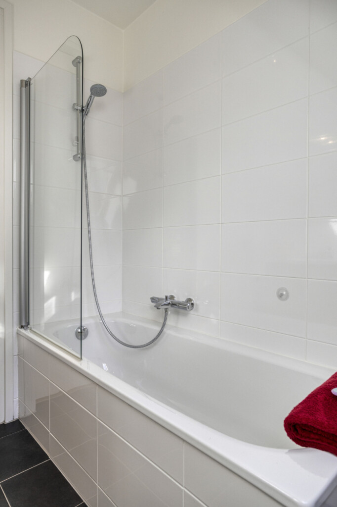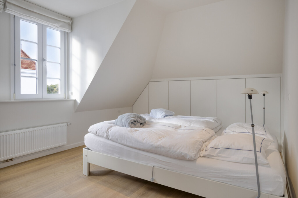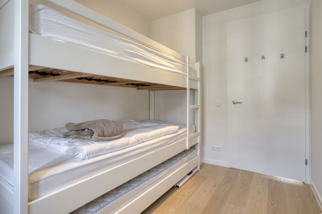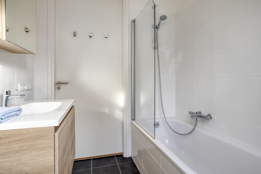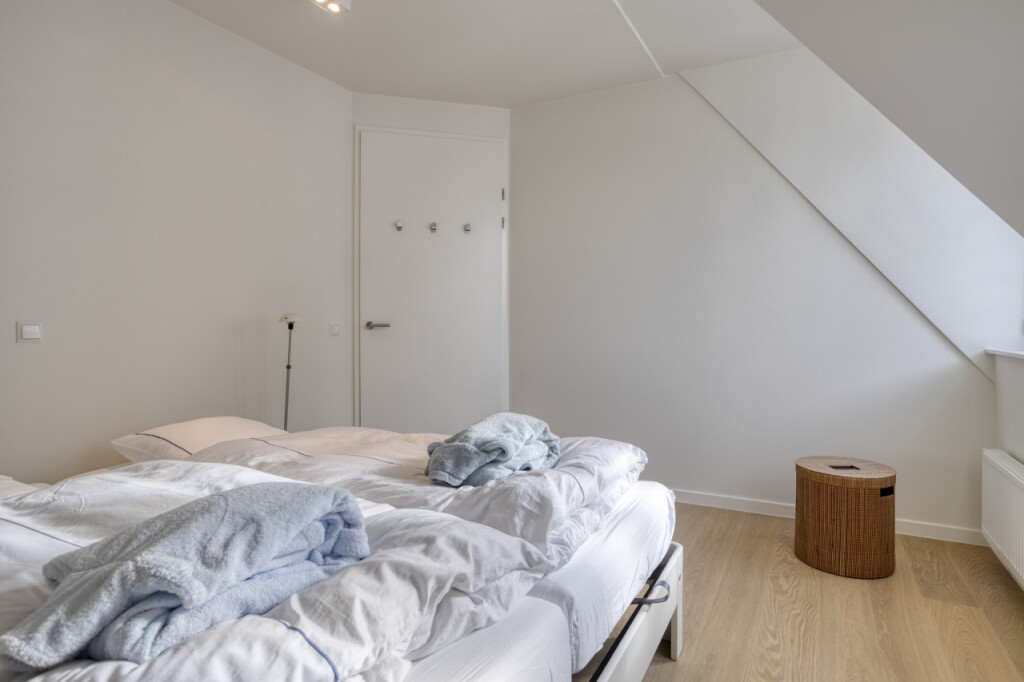 Het appartement beschikt over twee comfortabele slaapkamers. De hoofdslaapkamer is ingericht met een Auping-tweepersoonsbed en handige inbouwkasten onder het schuine dak. De tweede slaapkamer heeft een stapelbed en eveneens inbouwkasten, aangevuld met een knus bureautje onder het raam van de dakkapel, ideaal als kinder-, logeer- of werkruimte. De badkamer is uitgerust met een ligbad waarin ook gedoucht kan worden, een wastafelmeubel met spiegelkast en een handdoekradiator. Het toilet bevindt zich separaat van de badkamer.
