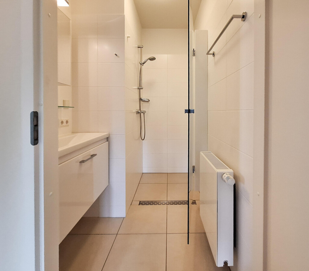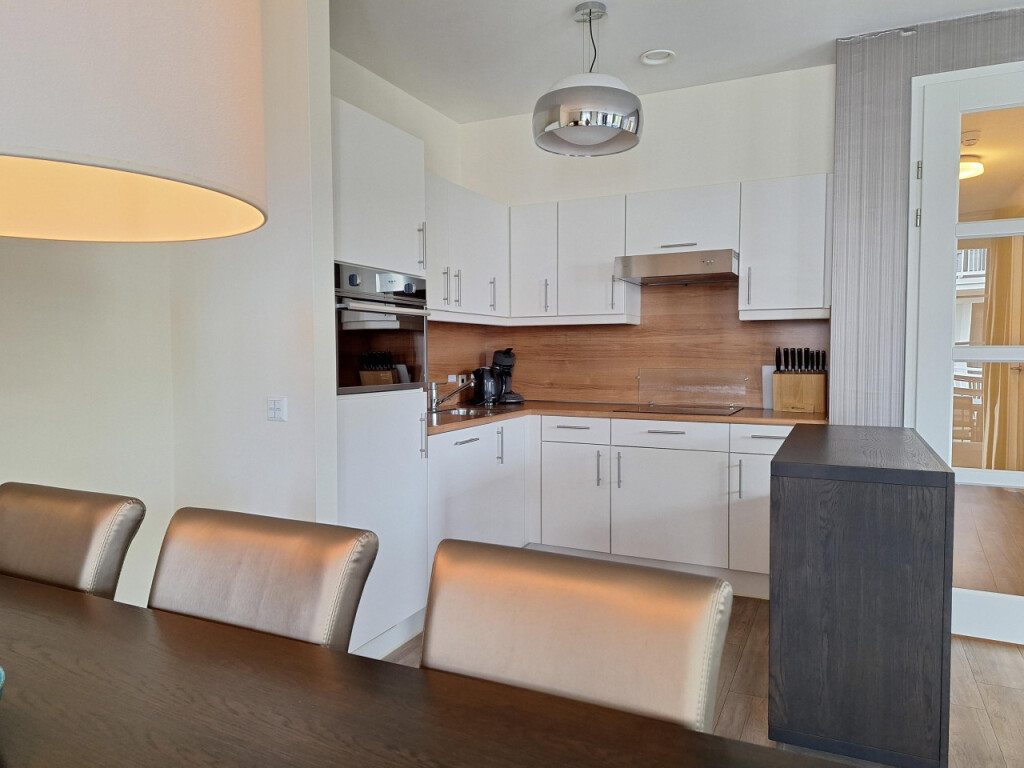 De ruime woonkamer met dubbele openslaande deuren naar het balkon vormt het hart van het appartement. De open keuken is volledig uitgerust met een keramische kookplaat, een combi-magnetron, een vaatwasser en een koelkast met vriesvak.