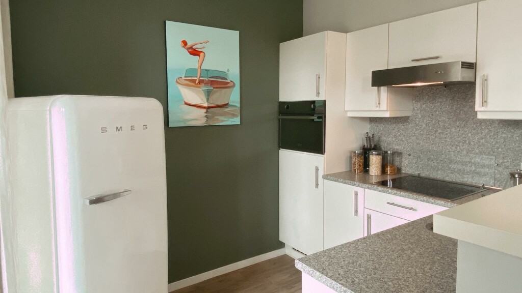 De halfopen keuken is uitgerust met een keramisch fornuis, afzuigkap, oven, SMEG koelkast met vriesvak en een vaatwasser. Ook vanuit de keuken heeft u via openslaande deuren toegang tot het balkon.
