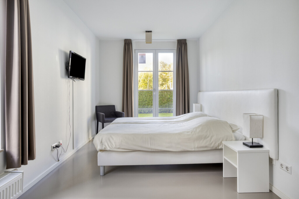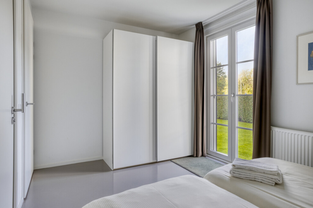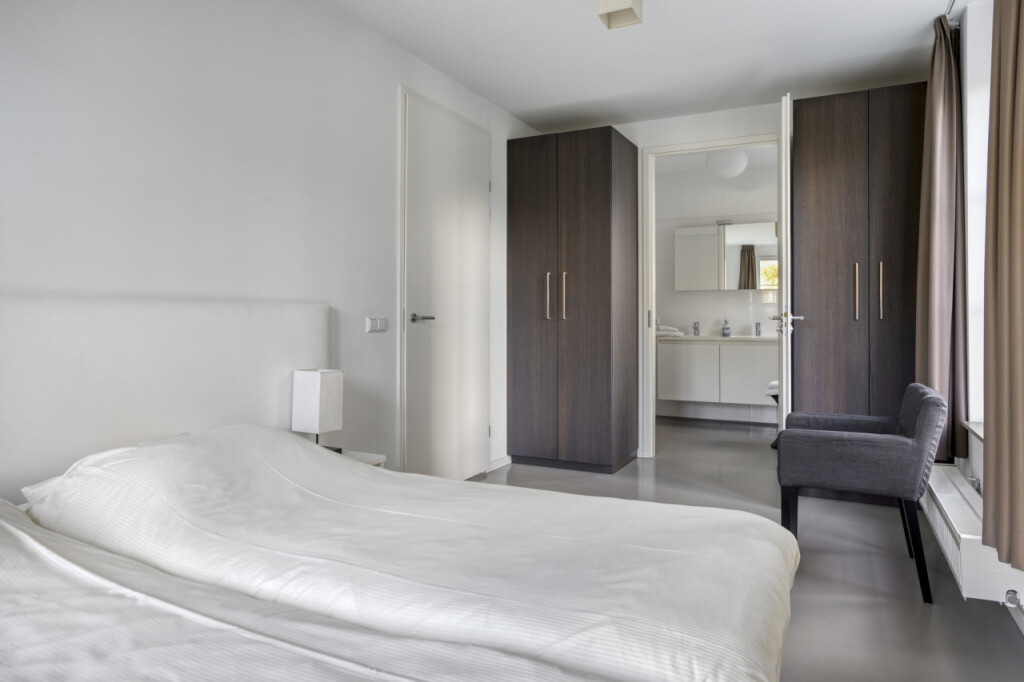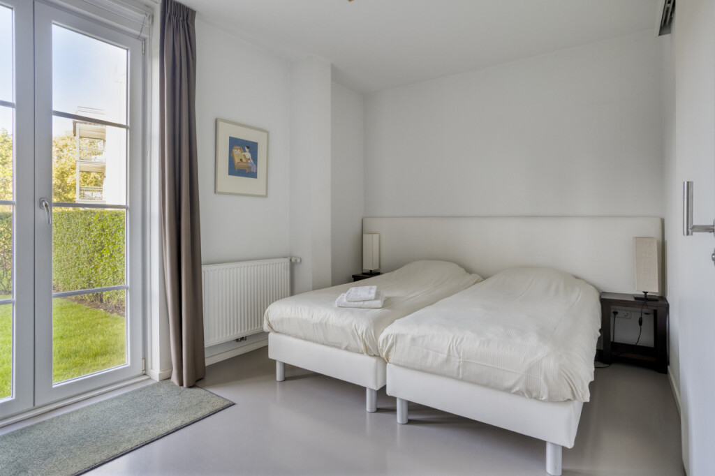 Het appartement beschikt over twee comfortabele slaapkamers, beide met openslaande deuren naar de tuin en een en-suite badkamer. De grootste slaapkamer beschikt daarnaast over twee vaste kasten en een tv-aansluiting. De hoofdbadkamer is luxe uitgevoerd met een ligbad, wastafelmeubel met dubbele wastafel, spiegelkast en toilet. De tweede badkamer, bereikbaar via een schuifdeur in de kleinere slaapkamer, is voorzien van een inloopdouche met regendouche en een modern wastafelmeubel met spiegelkast.