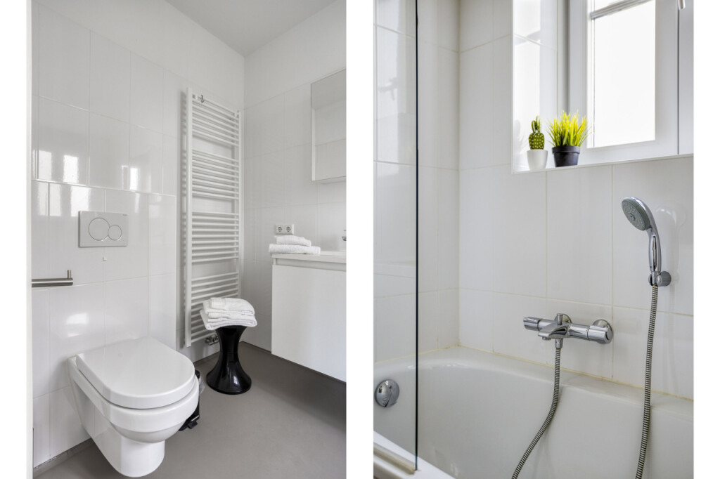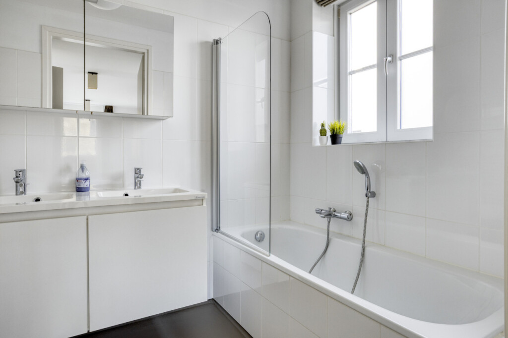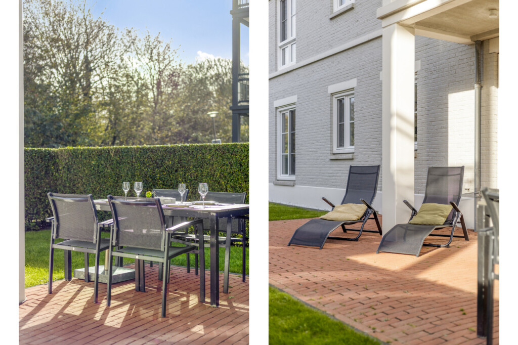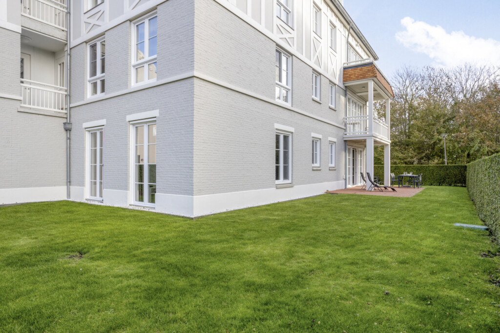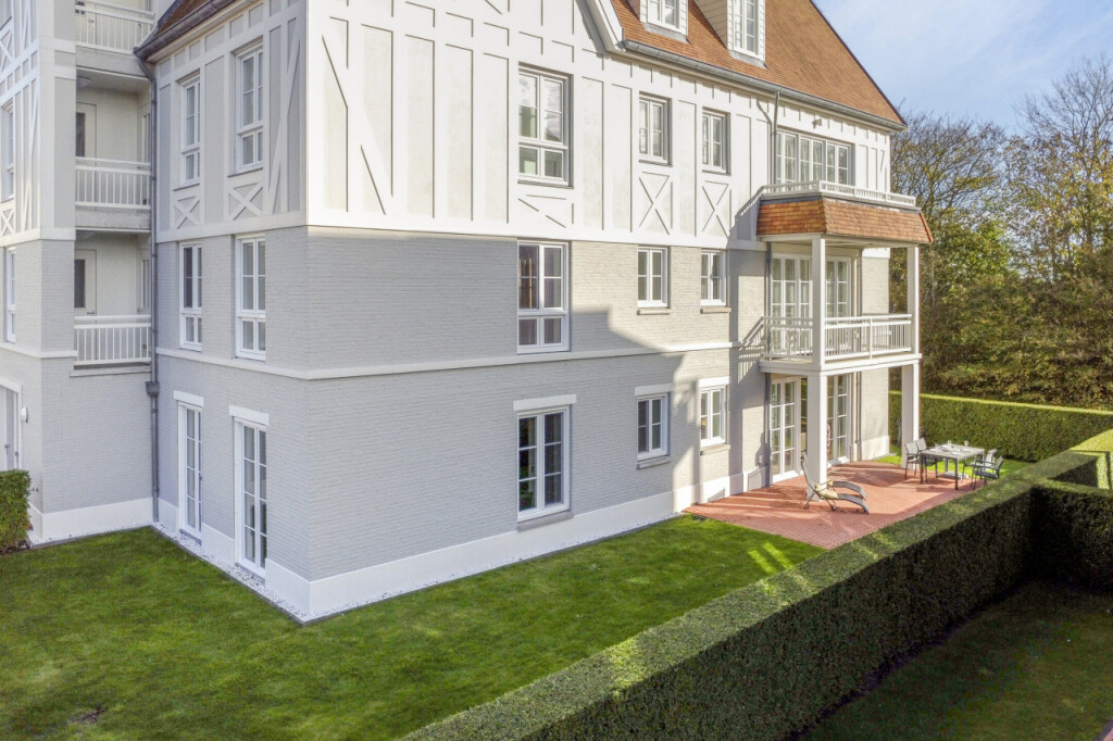 Het appartement beschikt over twee comfortabele slaapkamers, beide met openslaande deuren naar de tuin en een en-suite badkamer. De grootste slaapkamer beschikt daarnaast over twee vaste kasten en een tv-aansluiting. De hoofdbadkamer is luxe uitgevoerd met een ligbad, wastafelmeubel met dubbele wastafel, spiegelkast en toilet. De tweede badkamer, bereikbaar via een schuifdeur in de kleinere slaapkamer, is voorzien van een inloopdouche met regendouche en een modern wastafelmeubel met spiegelkast.