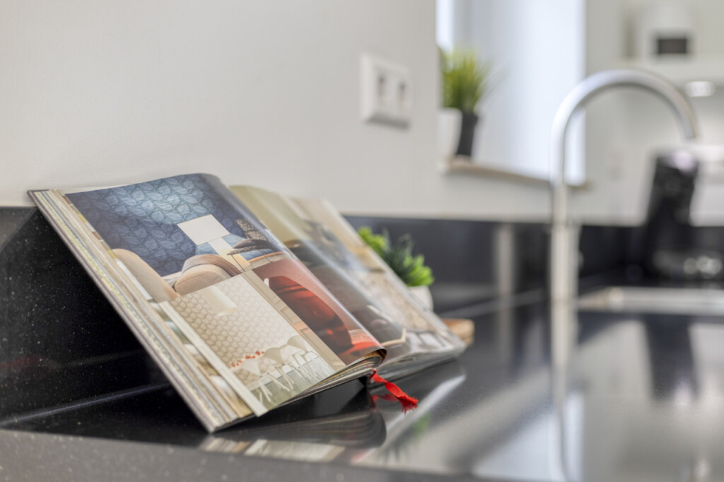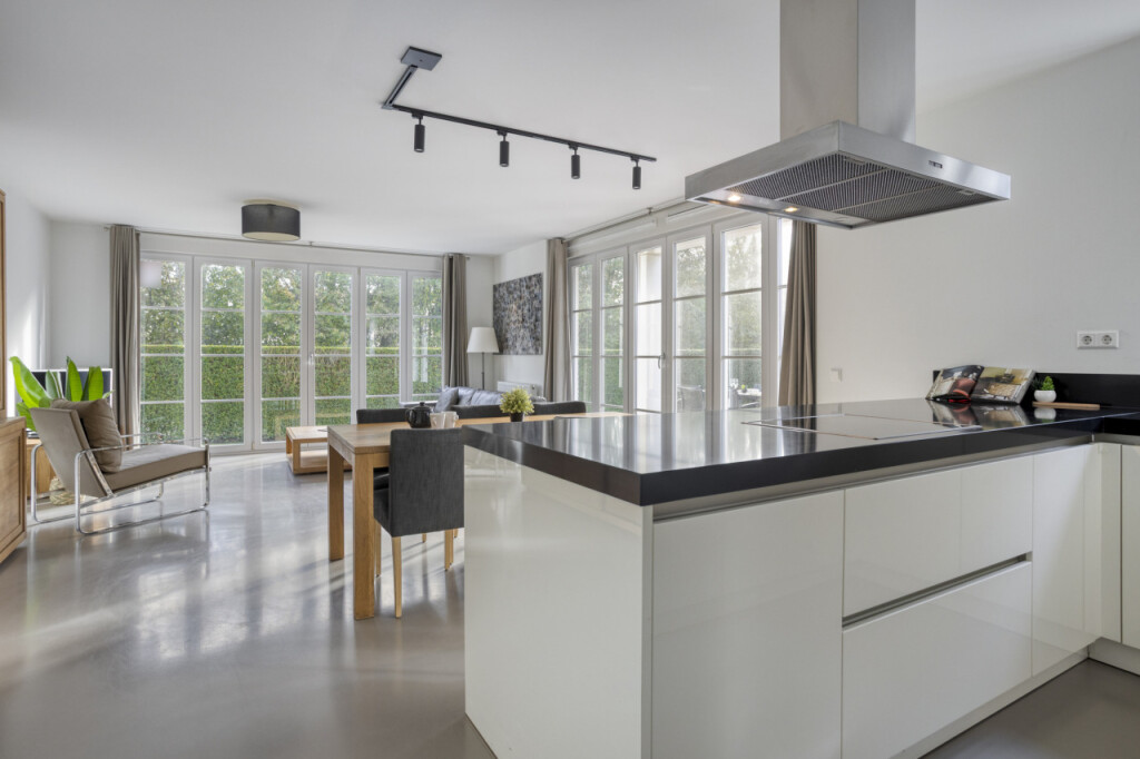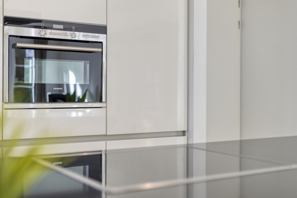 De keuken is modern ingericht met een composiet werkblad, veel kastruimte en inbouwapparatuur van Siemens, waaronder een inductiekookplaat met afzuigkap, combi-oven, koelkast met vriesvak en vaatwasser. Aangrenzend bevindt zich de praktische berging met aansluitingen voor wasmachine en droger.