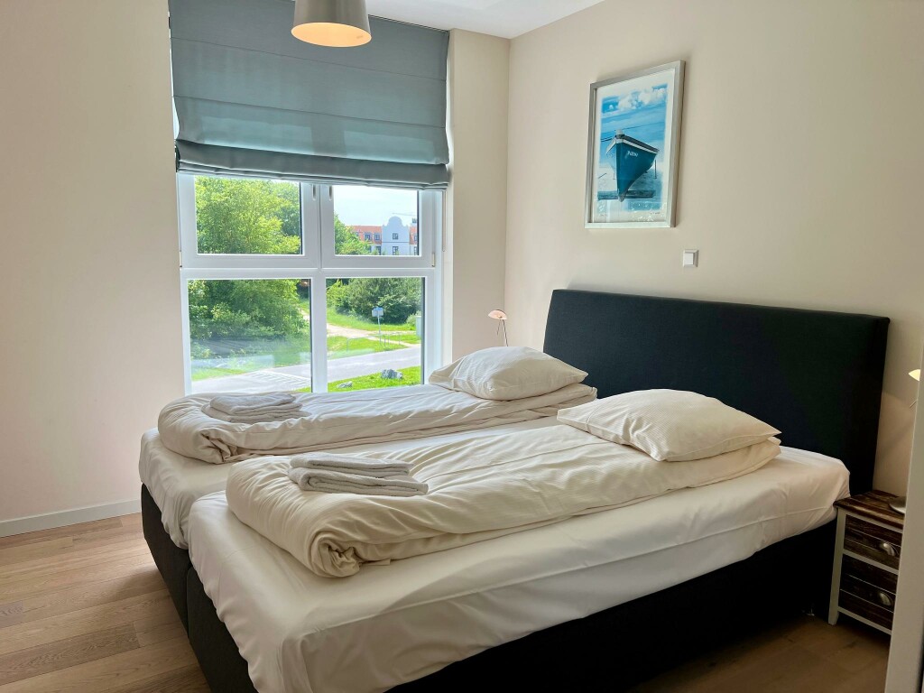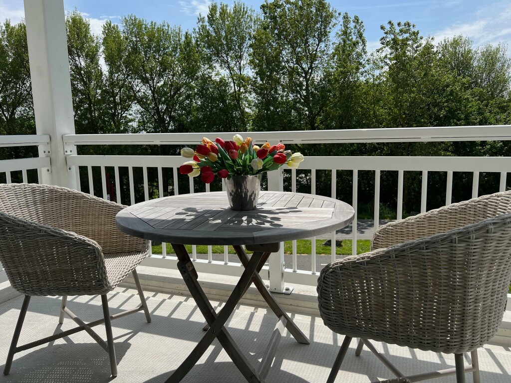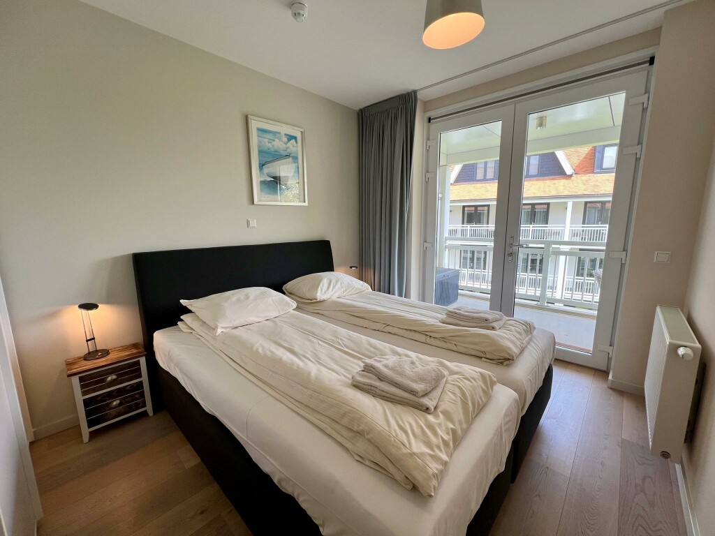 Eén slaapkamer heeft via openslaande deuren toegang tot het balkon met ochtendzon.
