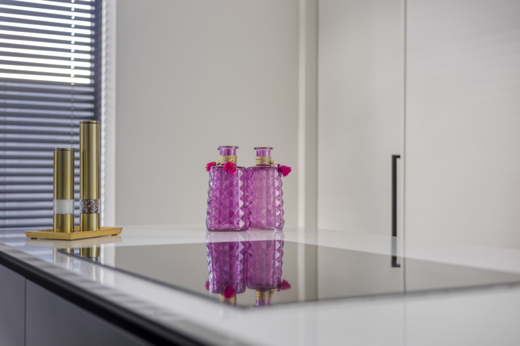 De open keuken vormt het hart van de woning: modern uitgevoerd in antraciet, met kookeiland en hoogwaardige inbouwapparatuur. Deze omvat een combi oven-magnetron, een aparte oven, een inbouw steamer en een klimaatkast. Aangrenzend ligt de bijkeuken met witgoedaansluiting, fonteintje en toegang tot de tuin. Achter de keuken bevindt zich bovendien een praktische werkkamer, eveneens met doorgang naar buiten.