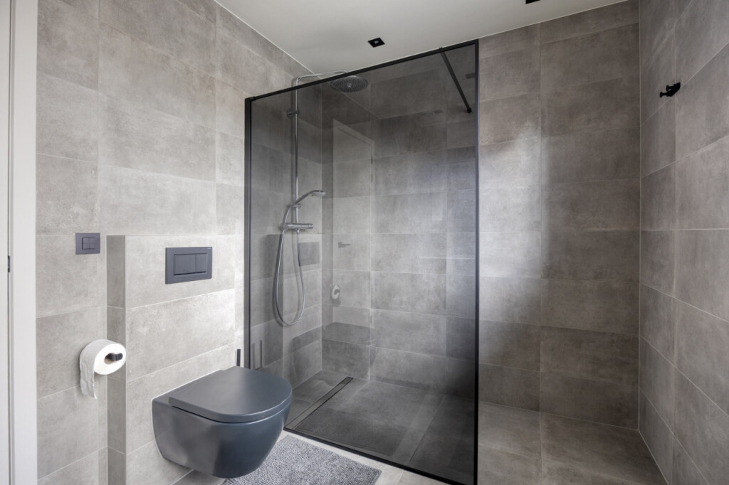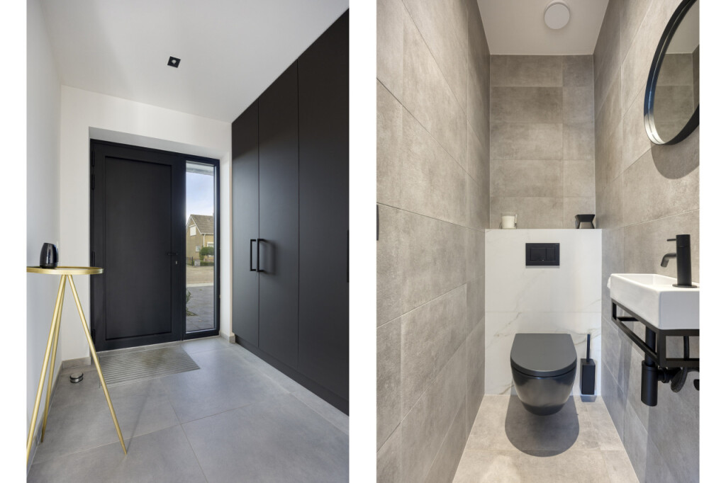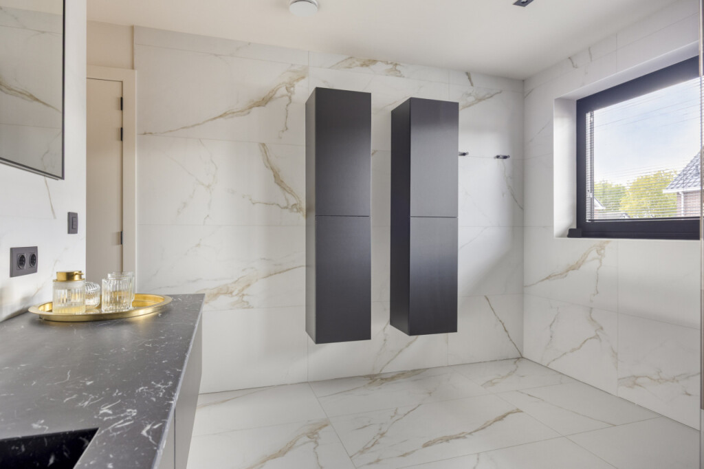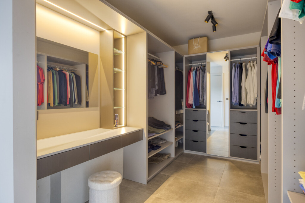 Op de eerste verdieping bevinden zich drie slaapkamers, stuk voor stuk voorzien van airconditioning. De hoofdslaapkamer beschikt over een ruime inloopkast en een luxe ensuite badkamer met inloopdouche, wastafelmeubel en toilet. De tweede badkamer, bereikbaar vanaf de overloop, is eveneens stijlvol afgewerkt en voorzien van een inloopdouche, toilet en wastafelmeubel.