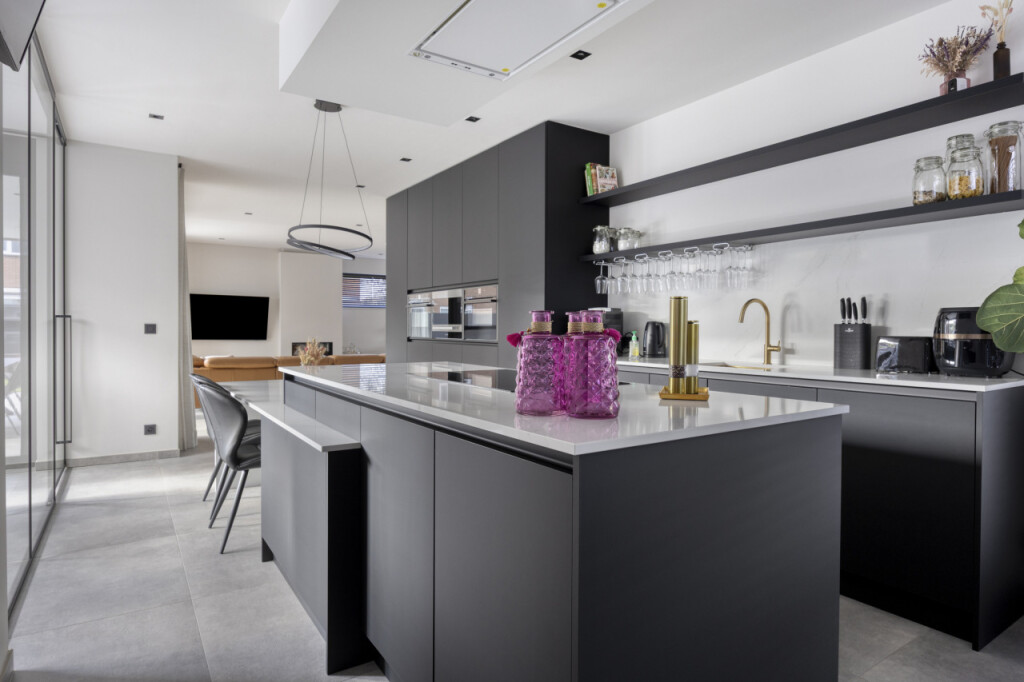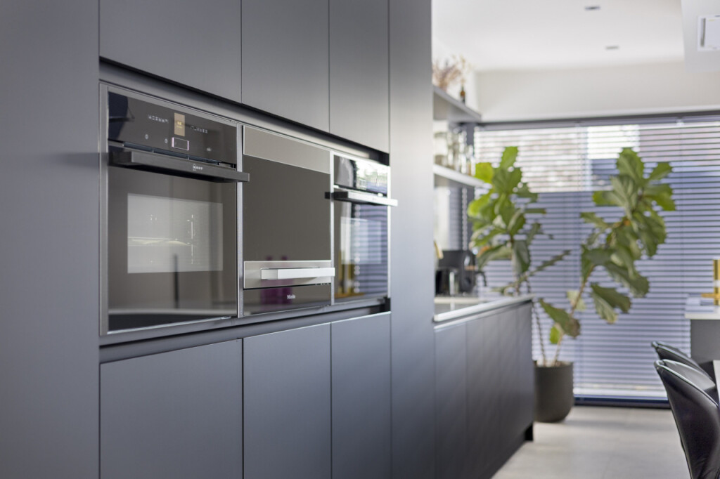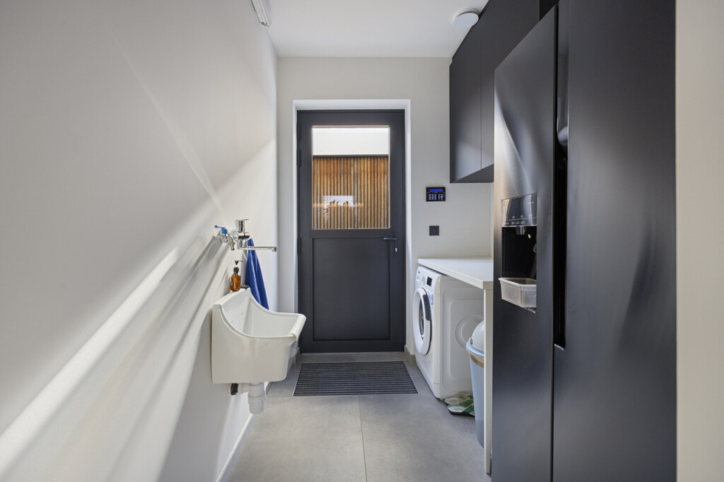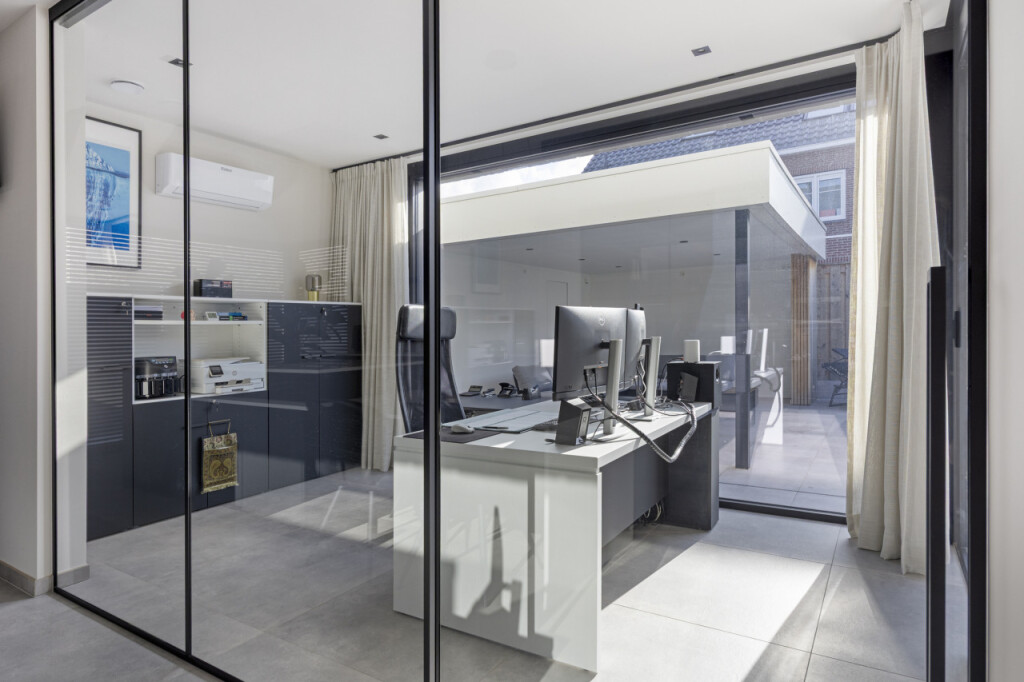 De open keuken vormt het hart van de woning: modern uitgevoerd in antraciet, met kookeiland en hoogwaardige inbouwapparatuur. Deze omvat een combi oven-magnetron, een aparte oven, een inbouw steamer en een klimaatkast. Aangrenzend ligt de bijkeuken met witgoedaansluiting, fonteintje en toegang tot de tuin. Achter de keuken bevindt zich bovendien een praktische werkkamer, eveneens met doorgang naar buiten.