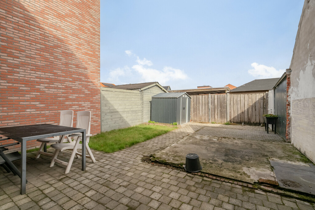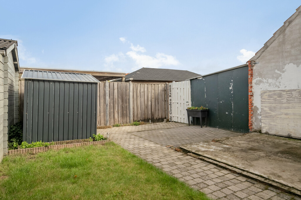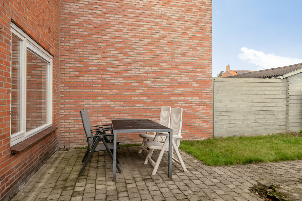 De achtertuin is gelegen op het noorden en onderhoudsvriendelijk aangelegd met een terras en gazon. Achterin staat een praktische berging en dankzij de eigen achterom is de tuin ook gemakkelijk bereikbaar voor fietsen of tuingereedschap.
