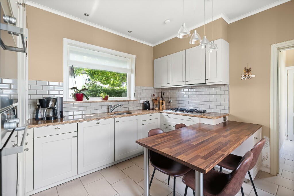 The spacious kitchen is equipped with all necessary built-in appliances and offers ample work space. From the kitchen, a hallway leads to the bathroom and the large backyard. The modern bathroom is equipped with a bathtub, walk-in shower, double sink, and toilet. There is also a sauna. The connections for laundry appliances are also found here.