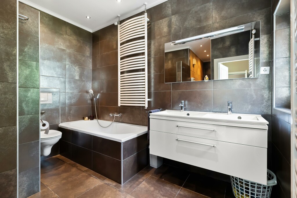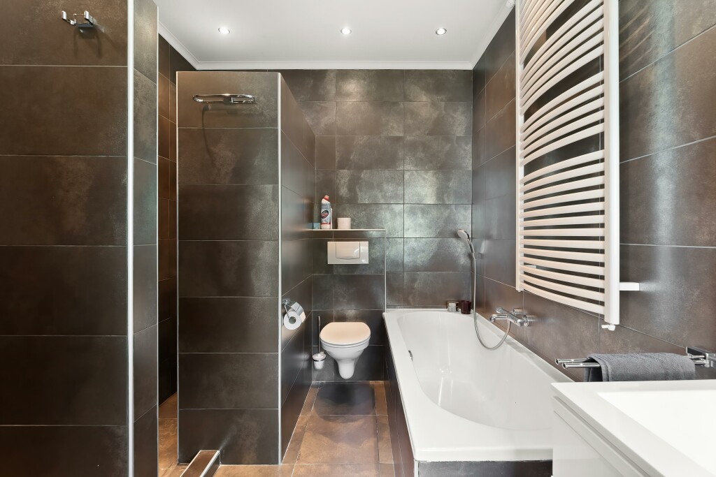 De ruime woonkeuken is ingericht met alle benodigde inbouwapparatuur en er is voldoende werkruimte. Vanuit de keuken heb je via een tussenhal toegang tot de badkamer en de royale achtertuin. De moderne badkamer is uitgerust met een ligbad, inloopdouche, dubbele wastafel en een toilet. Ook is er een sauna aanwezig. De aansluitingen voor witgoedapparatuur vind je eveneens hier.