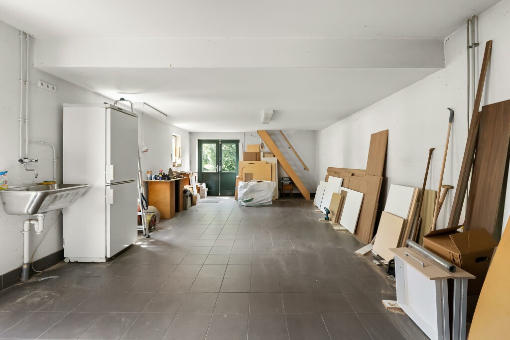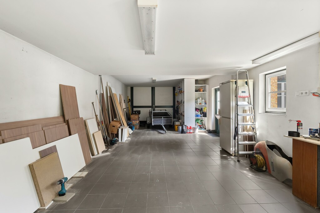 De garage, met aan de voorzijde een ruime oprit, is voorzien van een nette tegelvloer en een spoelbak. Via een vaste trap is een volledig extra woongedeelte bereikbaar met een slaapkamer, badkamer met douche, wastafel met meubel en toilet en een keukenblok met apparatuur.