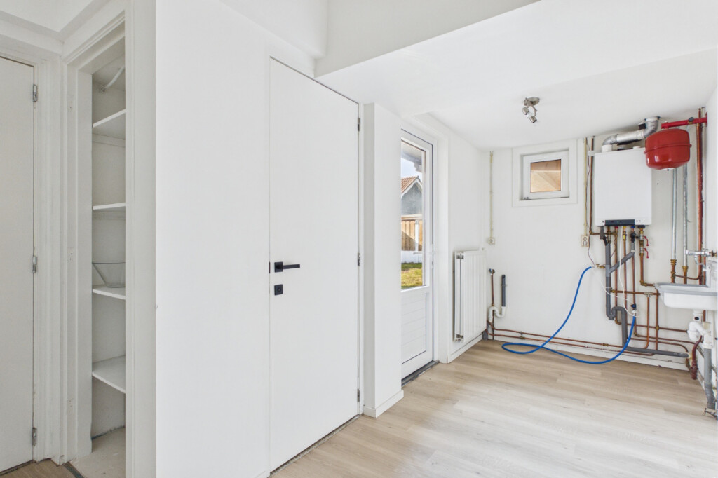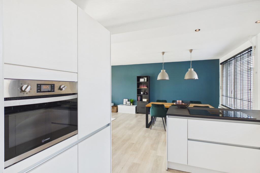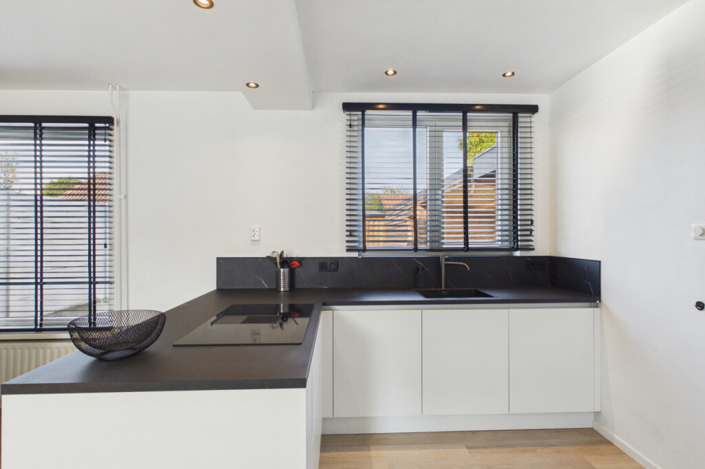 Bij binnenkomst kom je in een ruime hal met de trapopgang naar de eerste verdieping en toegang tot de woonkamer en keuken. De woonkamer is open en licht, wat zorgt voor een aangename leefruimte. De moderne en luxe keuken uit 2022 sluit hier naadloos op aan en is uitgerust met een inductiekookplaat met geïntegreerde afzuiging, een afwasmachine, koelkast en een combi-oven. Vanuit de keuken bereik je de bijkeuken, waar zich de cv-ketel bevindt, aansluitingen voor wasmachine en droger aanwezig zijn en een extra wasbakje is geplaatst. Vanuit de bijkeuken is er toegang tot het toilet, de garage en de achterdeur naar de tuin.