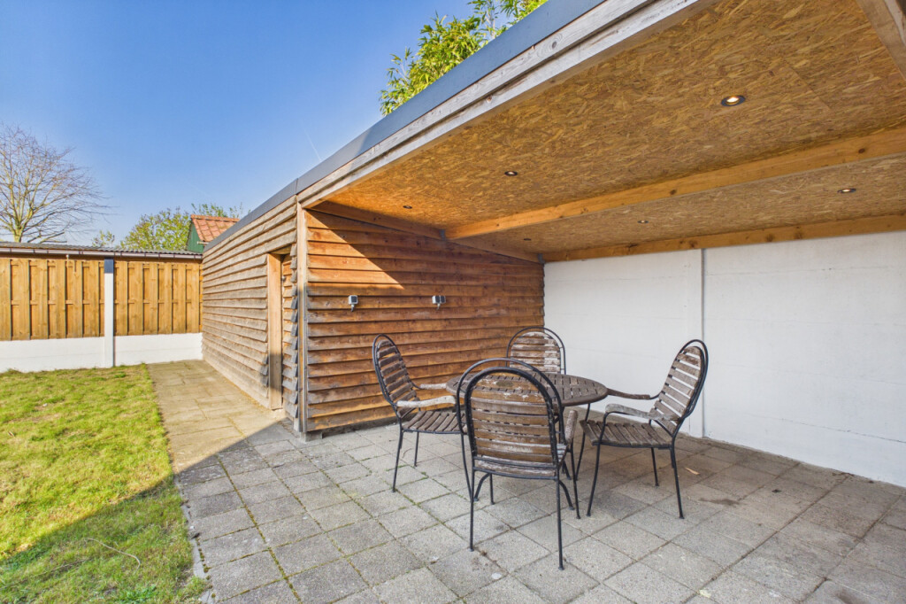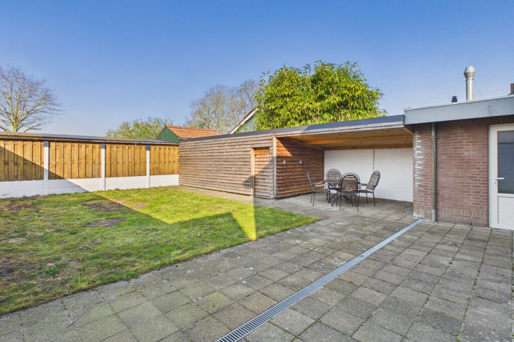 De zonnige achtertuin is ruim van opzet en biedt volop mogelijkheden om heerlijk buiten te genieten. Dankzij de vrije ligging aan de achterzijde ervaar je hier extra rust en privacy. Daarnaast beschikt de tuin over een ruime schuur en een gezellige overkapping, waardoor je hier het hele jaar door comfortabel kunt verblijven en extra bergruimte tot je beschikking hebt.