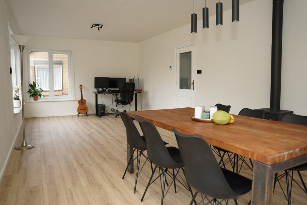 De ruime woonkamer heeft grote raampartijen, die zorgen voor een zee van licht en een fijne verbinding met buiten. De kamer is voorzien van een mooie PVC vloer en een houtkachel zorg voor gezellige en aangename bijverwarming op koude dagen.