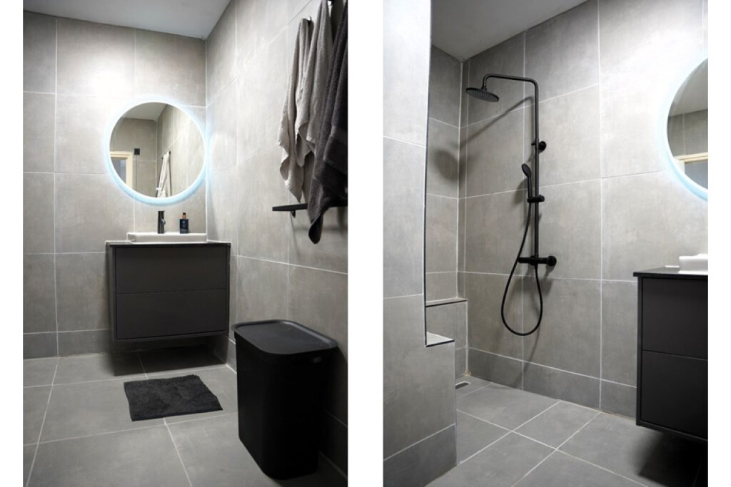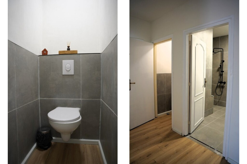 De moderne, vernieuwde badkamer beschikt over een inloopdouche en een wastafelmeubel. Naast de badkamer is, in een aparte ruimte, het moderne toilet.