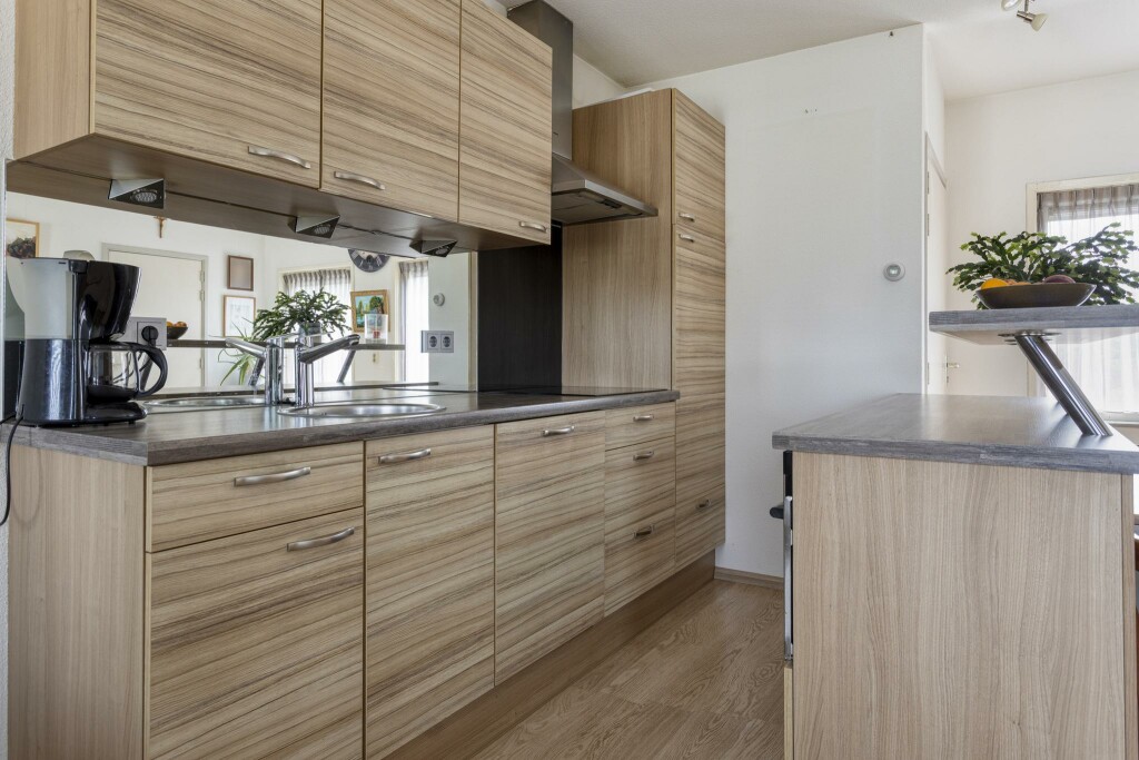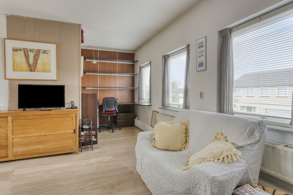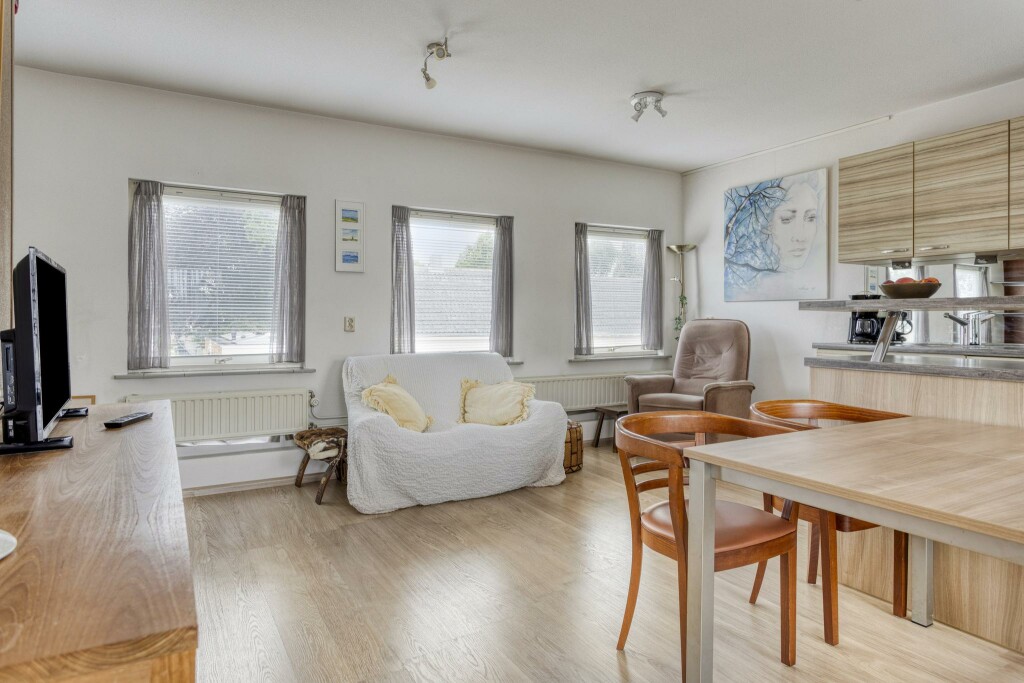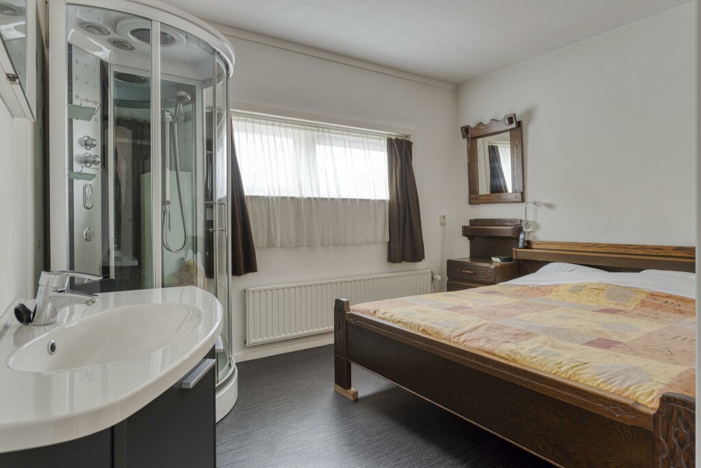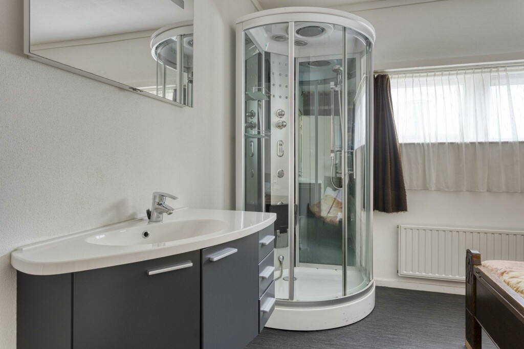De eerste verdieping is ingericht als volwaardige woonetage. Hier bevindt zich een comfortabele slaapkamer met een en-suite douche en een lichte woonkamer met open keuken. De combinatie van woon- en slaapruimte op één niveau zorgt voor overzichtelijkheid en rust, terwijl de indeling voldoende mogelijkheden biedt om het geheel naar eigen smaak aan te passen.