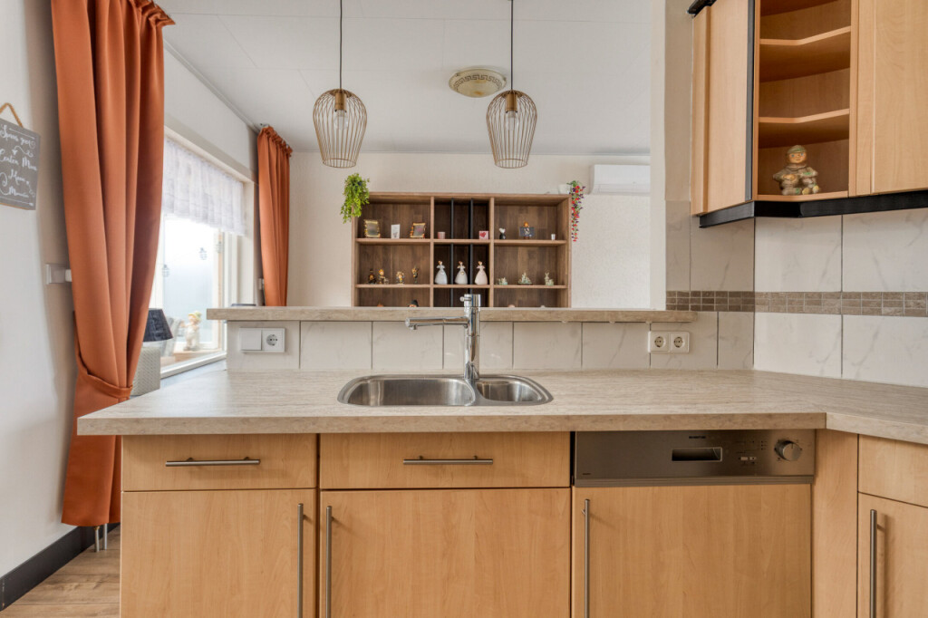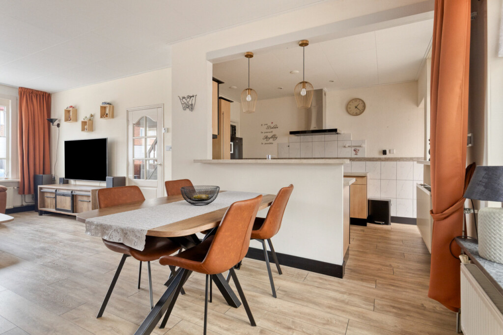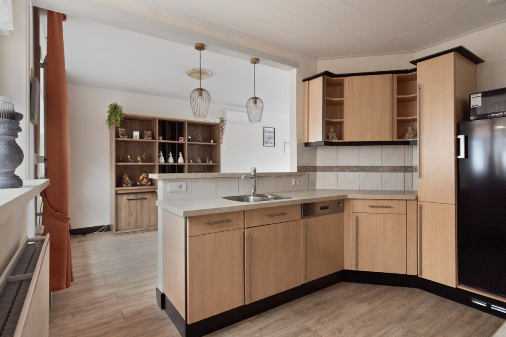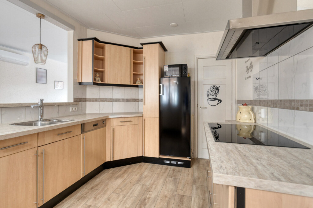 Entree in de hal met meterkast en trapopgang. Heerlijk lichte woonkamer met airco. De open keuken heeft een hoekopstelling en is voorzien van een inductie kookplaat, afzuigkap, koelkast, vaatwasser en een diepe trapkast. Vanuit de keuken toegang tot de bijkeuken waar de aansluiting is voor de wasapparatuur, de c.v-ketel (huurketel), toilet en een deur naar de tuinkamer. De royale tuinkamer is een heerlijke plek om te genieten. Vanuit hier heb je prachtig uitzicht en toegang naar de tuin.