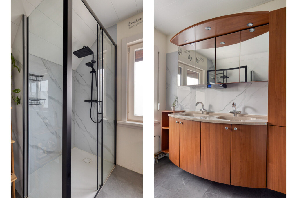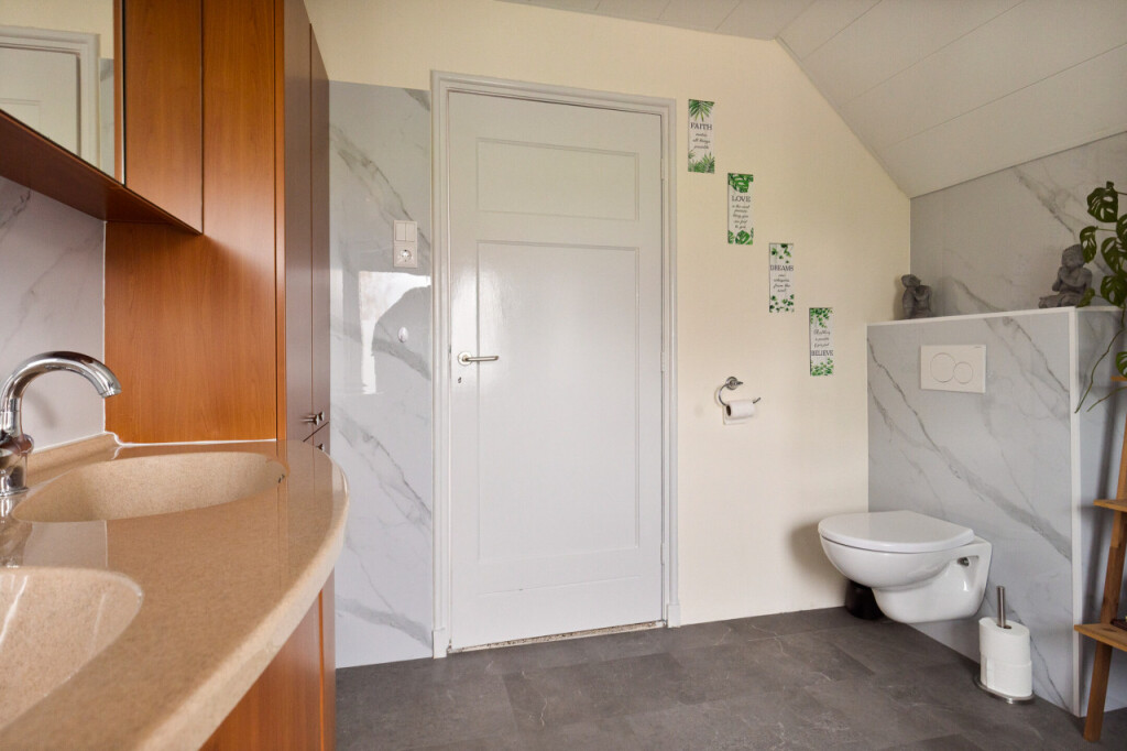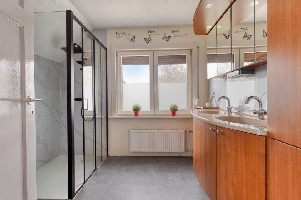 Overloop met PVC vloer en airco. Aan de voorzijde van de woning een ruime en een kleine slaapkamer. Aan de achterzijde van de woning een middelgrote slaapkamer met grote kastenwand. De ruime badkamer heeft een grote inloopdouche, een wasmeubel met dubbele wastafel en een 2e toilet. Alle kamers op deze verdieping hebben kunststof kozijnen met dubbel glas en rolluiken.