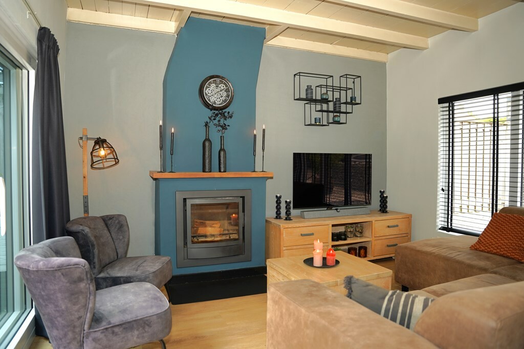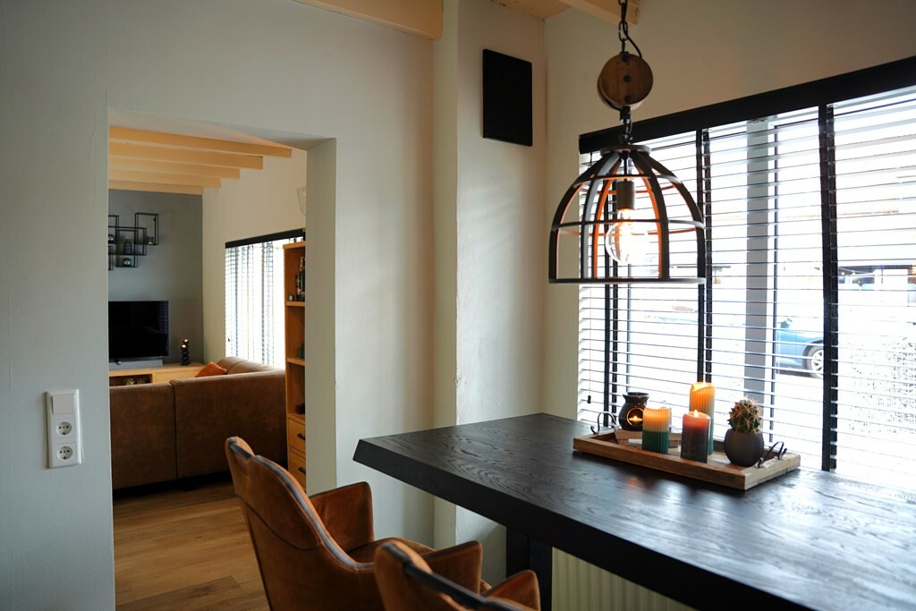 De woonkamer met schouw en houthaard, pvc vloer en authentiek balken plafond heeft tuindeuren naar het terras. Dit zorgt ervoor dat het binnen- en buitenleven naadloos in elkaar overlopen.