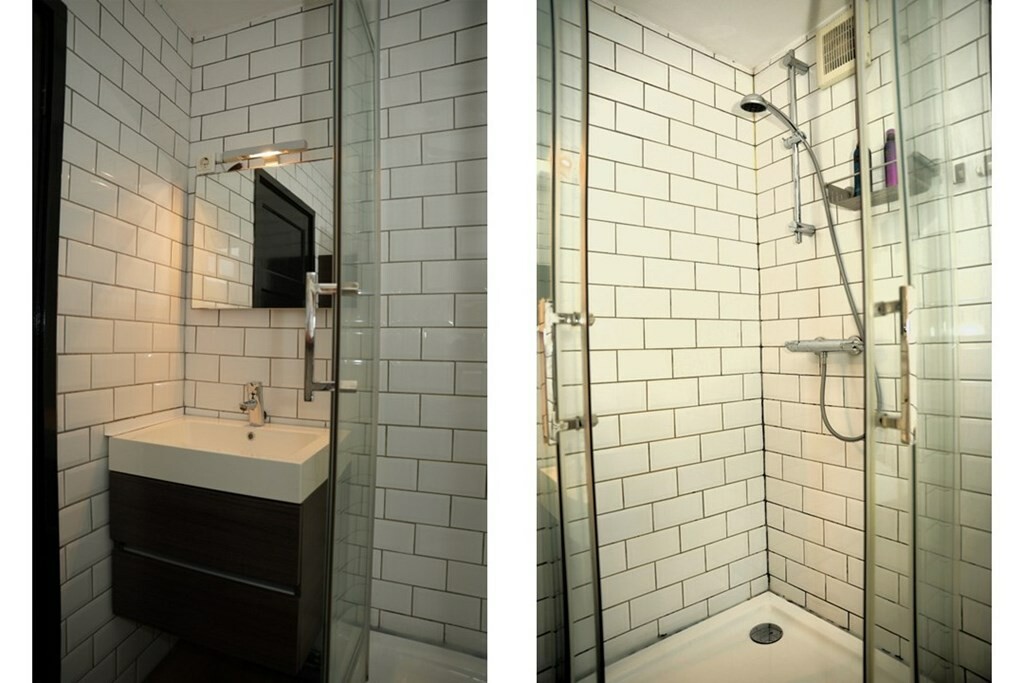 Vanuit de keuken is er via een gangetje toegang tot, aan de ene zijde het toilet, en aan de andere zijde de badkamer met douchecabine en wastafelmeubel. Ook vind je hier de aansluiting voor de wasmachine.