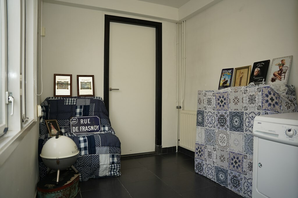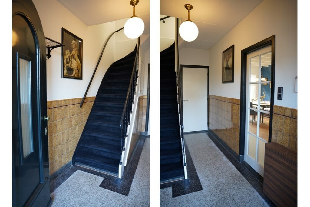 Via de voordeur met glas-in-lood raam stap je binnen in een hal die je meeneemt naar de stijl van de dertiger jaren. De originele granito vloer en de speelse wandtegels zorgen voor een unieke sfeer, terwijl de statige trap het perfecte decor vormt voor een warm en nostalgisch welkom.