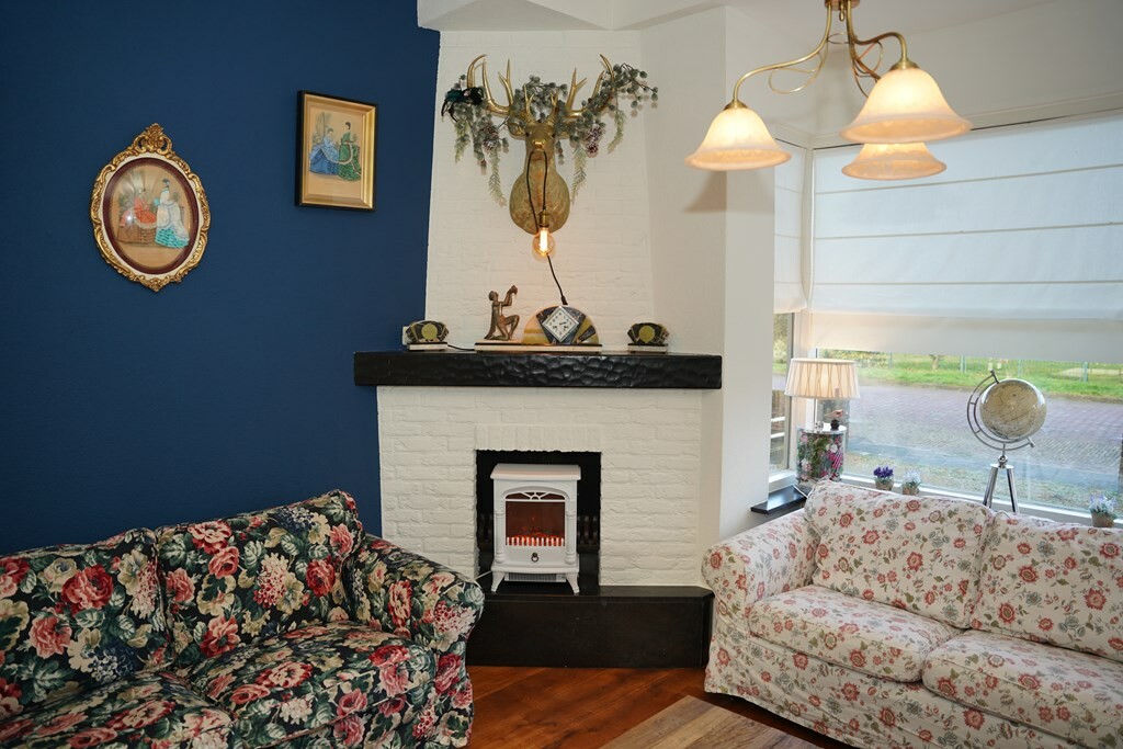 Vanuit de hal loop je – via de glazen deur - door naar de woonkamer. De houten vloerdelen geven warmte en karakter, terwijl het balkenplafond zorgt voor een landelijke touch. Door de erker aan de voorzijde stroomt het daglicht binnen en heb je een fijne plek om te zitten met een drankje of een boek. Maar ook kun je hier genieten van het zicht, want je kijkt bijna tot de duinen.