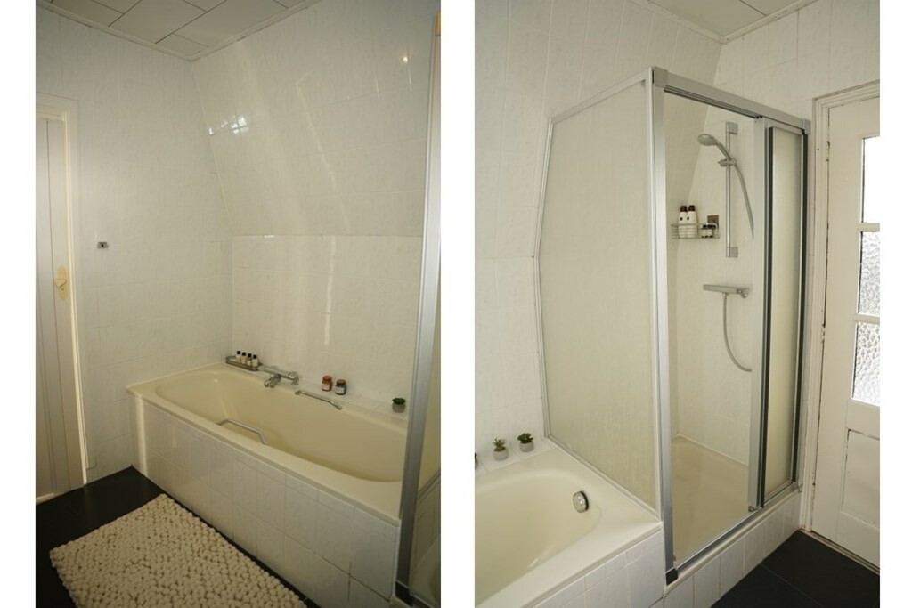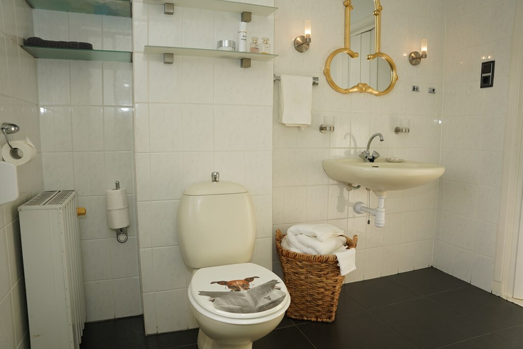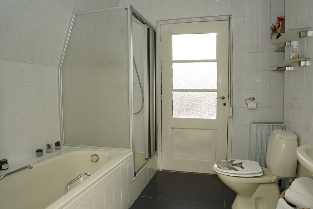 De badkamer is voorzien van een ligbad, een douchecabine, een wastafel en een 2e toilet.