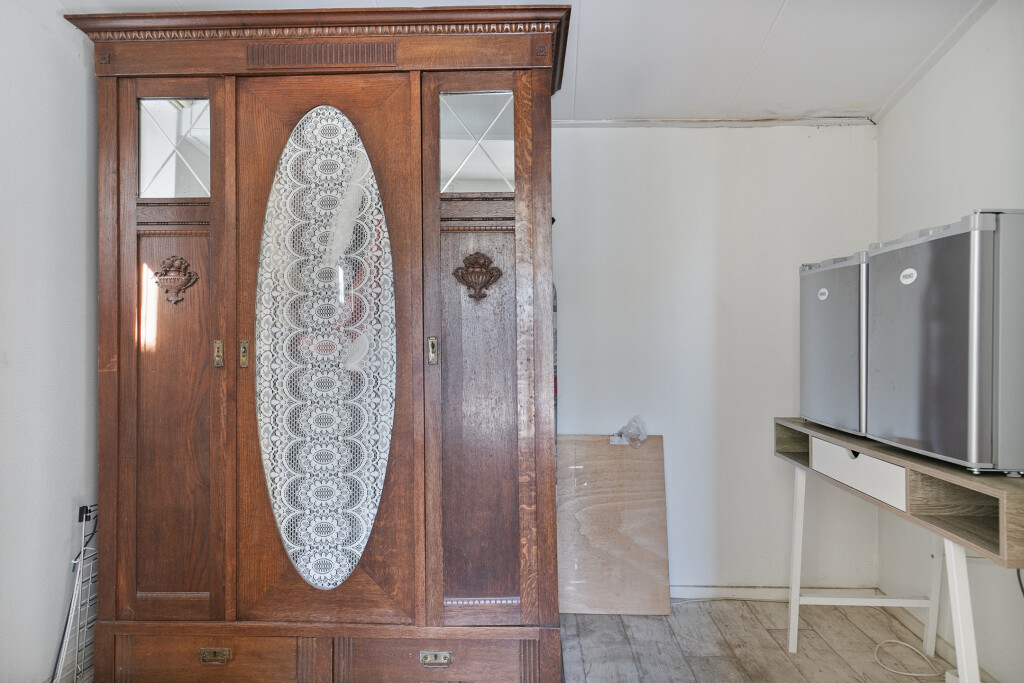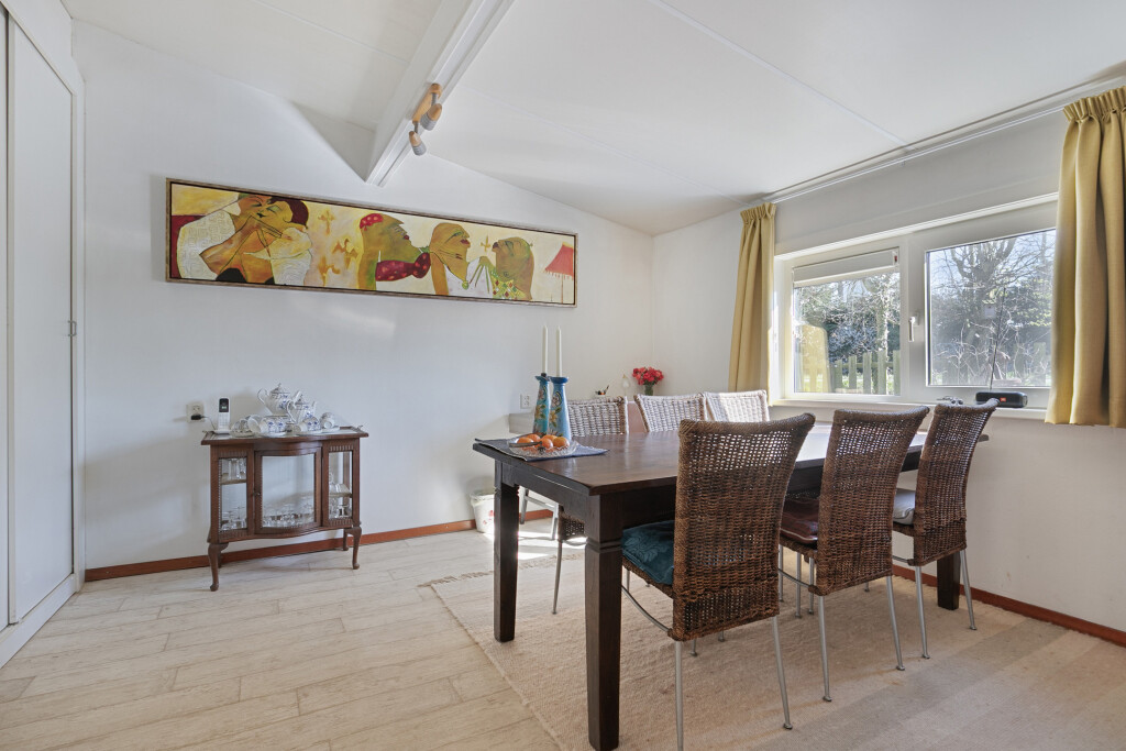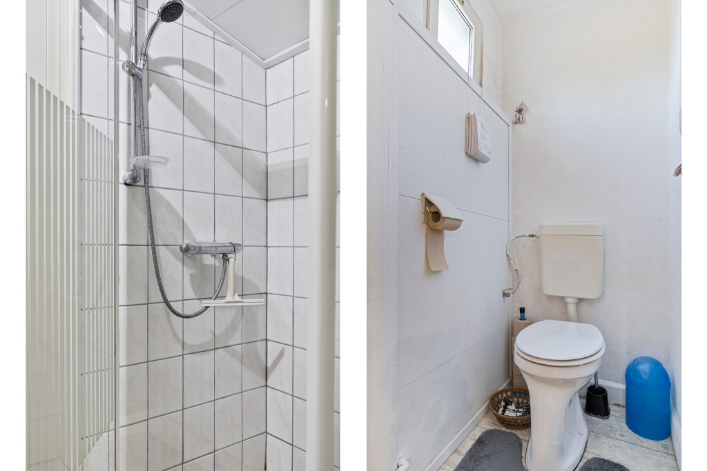 Een groot pluspunt is de aanwezigheid van zowel een slaapkamer als de badkamer op de begane grond, wat deze woning levensloopbestendig maakt. De badkamer is uitgerust met een douche, wastafel en aansluiting voor de wasmachine. Aansluitend vindt u een kleine gang met een aparte toiletruimte en toegang tot de eetkamer, die is voorzien van handige opbergruimte met vaste kasten. De eetkamer sluit weer aan op de woonkamer, wat zorgt voor een logische en open indeling.