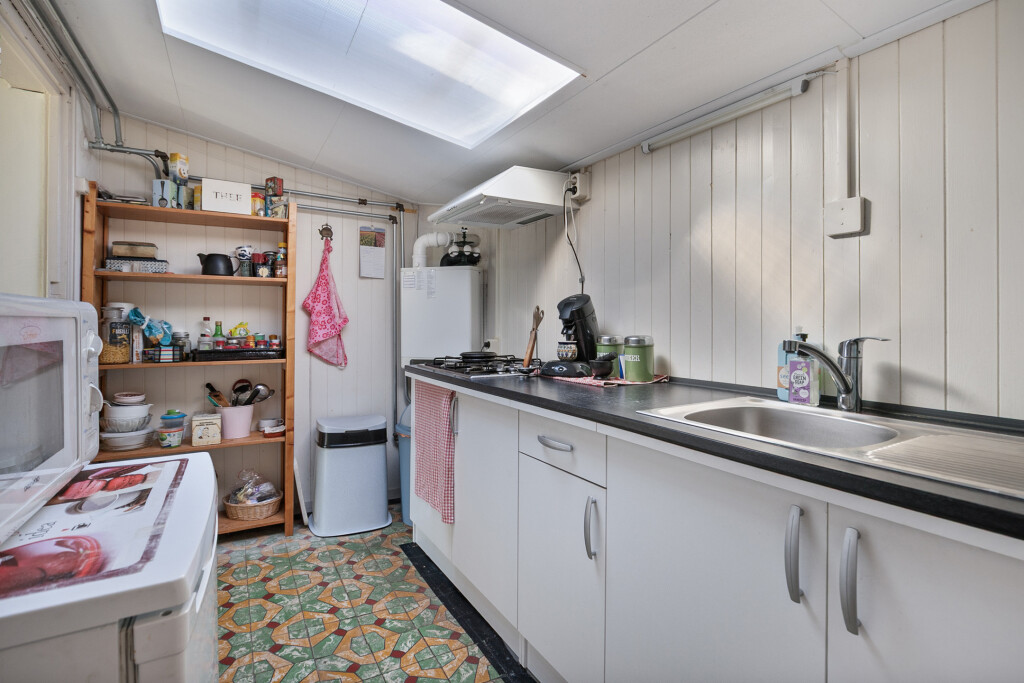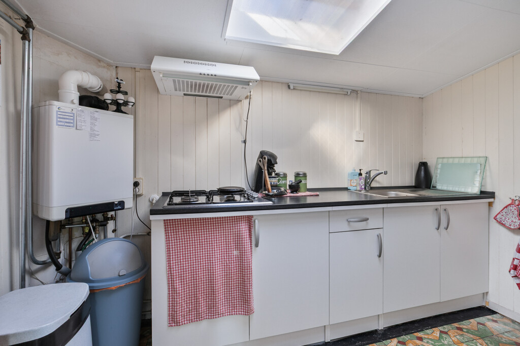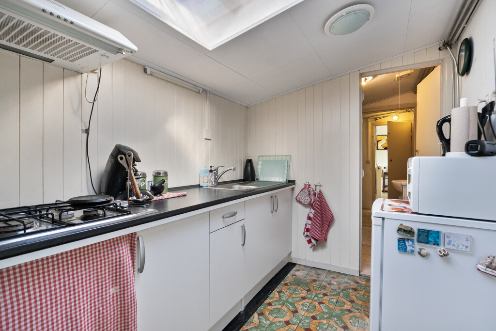 Bij binnenkomst in de hal heeft u direct toegang tot de gezellige woonkamer, de gesloten keuken en één van de drie slaapkamers. De lichte woonkamer is voorzien van een elektrisch zonnescherm – ideaal op warme zomerdagen. De keuken beschikt over vaste kastruimte, een 4-pits gaskookplaat, en een afzuigkap.