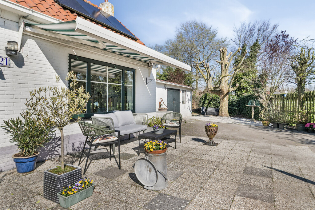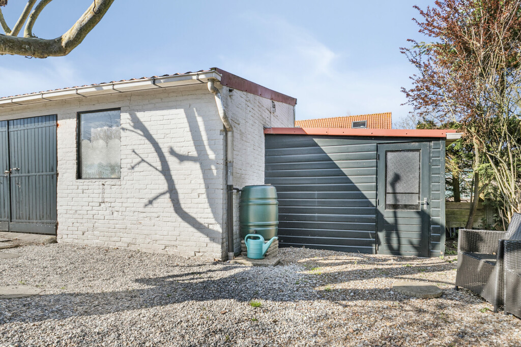 De zonnige voortuin op het zuiden beschikt over een mooi terras waar u de hele dag van de zon kunt genieten. Daarnaast beschikt de woning over een ruime garage met openslaande deuren en een separate houten berging – ideaal voor het stallen van fietsen, tuingereedschap of als klusruimte.