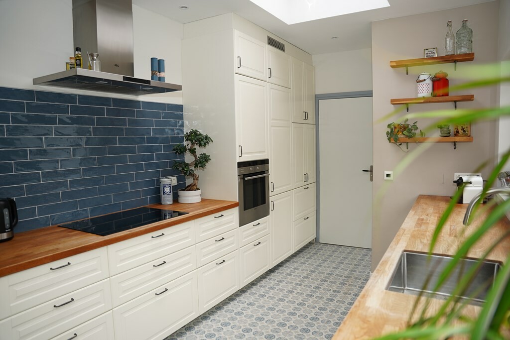 De open keuken met een ruim aanrecht aan 2 zijden is van alle gemakken voorzien met onder andere een moderne oven, een vaatwasser en een inductie kookplaat. Een groot raam richting de tuin zorgt hier voor een zee aan daglicht.