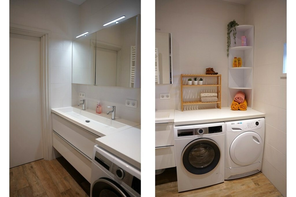 Via de keuken kom je in de stijlvol ingerichte badkamer met inloopdouche, dubbele wastafel en aansluiting voor de wasmachine. Naast de badkamer is een apart toilet met een fonteintje.