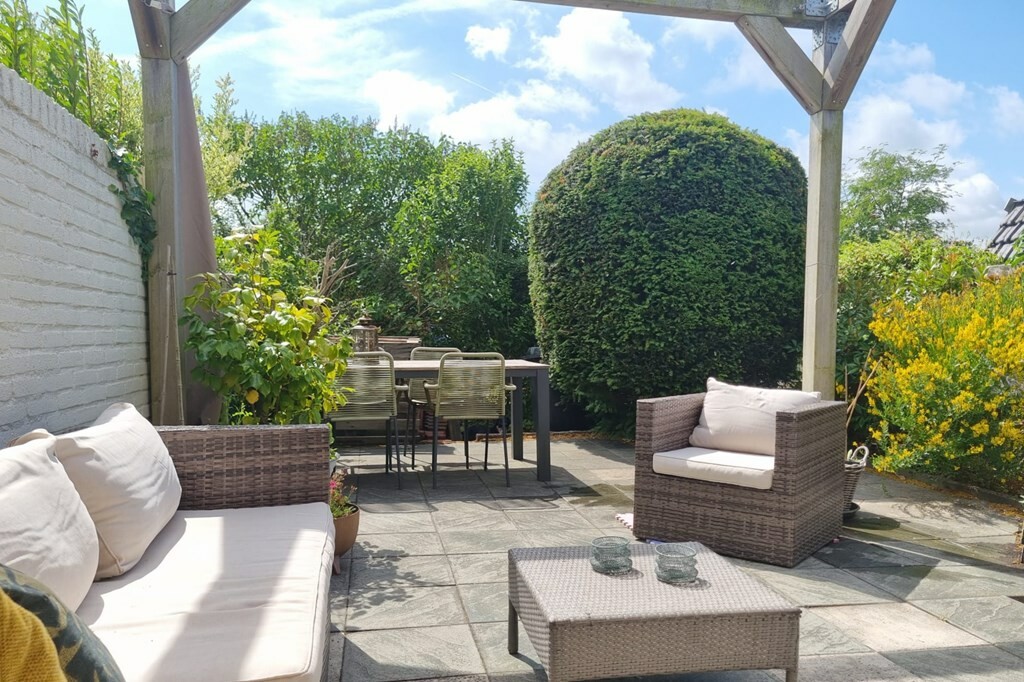 De diepe tuin is gelegen op het Zuiden en grenst aan een akkerland. Het zonneterras nodigt uit tot ontspanning te midden van je eigen groene oase van rust en privacy.